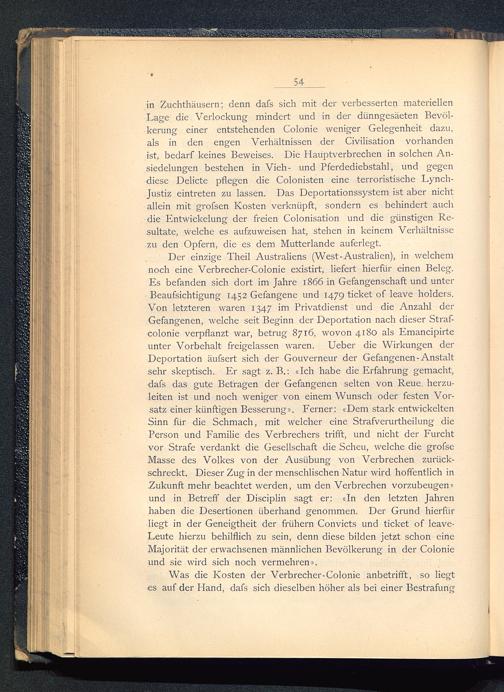 in Zuchthäusern; denn dafs sich mit der verbesserten materiellenLage die Verlockung mindert und in der dünngesäeten Bevöl-kerung einer entstehenden Colonie weniger Gelegenheit dazu,als in den engen Verhältnissen der Civilisation vorhandenist, bedarf keines Beweises. Die Hauptverbrechen in solchen An-siedelungen bestehen in Vieh- und Pferdediebstahl, und gegendiese Delicte pflegen die Colonisten eine terroristische Lynch-justiz eintreten zu lassen. Das Deportationssystem ist aber nichtallein mit grofsen Kosten verknüpft, sondern es behindert auchdie Entwickelung der freien Colonisation und die günstigen Re-sultate, welche es aufzuweisen hat, stehen in keinem Verhältnissezu den Opfern, die es dem Mutterlande auferlegt.