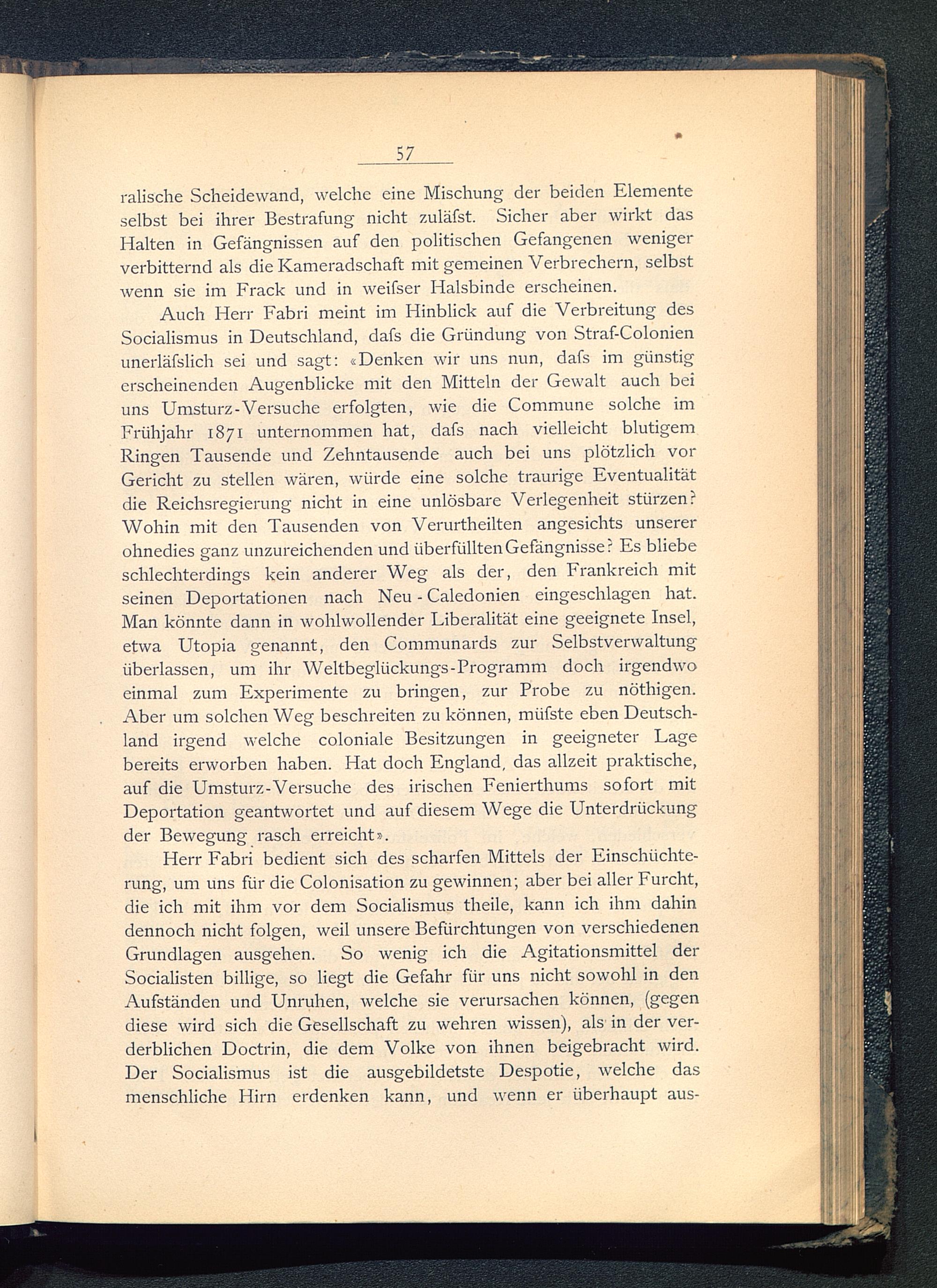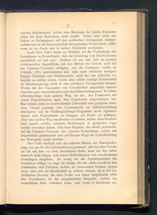 Auch Herr Fabri meint im Hinblick auf die Verbreitung desSocialismus in Deutschland , dafs die Gründung von Straf-Colonienunerläfslich sei und sagt: «Denken wir uns nun, dafs im günstigerscheinenden Augenblicke mit den Mitteln der Gewalt auch beiuns Umsturz-Versuche erfolgten, wie die Commune solche imFrühjahr 1871 unternommen hat, dafs nach vielleicht blutigemRingen Tausende und Zehntausende auch bei uns plötzlich vorGericht zu stellen wären, würde eine solche traurige Eventualitätdie Reichsregierung nicht in eine unlösbare Verlegenheit stürzen?Wohin mit den Tausenden von Verurtheilten angesichts unsererohnedies ganz unzureichenden und überfüllten Gefängnisse? Es bliebeschlechterdings kein anderer Weg als der, den Frankreich mitseinen Deportationen nach Neu - Caledonien eingeschlagen hat.Man könnte dann in wohlwollender Liberalität eine geeignete Insel,etwa Utopia genannt, den Communards zur Selbstverwaltungüberlassen, um ihr Weltbeglückungs-Programm doch irgendwoeinmal zum Experimente zu bringen, zur Probe zu nöthigen.Aber um solchen Weg beschreiten zu können, müfste eben Deutsch-land irgend welche coloniale Besitzungen in geeigneter Lagebereits erworben haben. Hat doch England , das allzeit praktische,auf die Umsturz-Versuche des irischen Fenierthums sofort mitDeportation geantwortet und auf diesem Wege die Unterdrückungder Bewegung rasch erreicht».