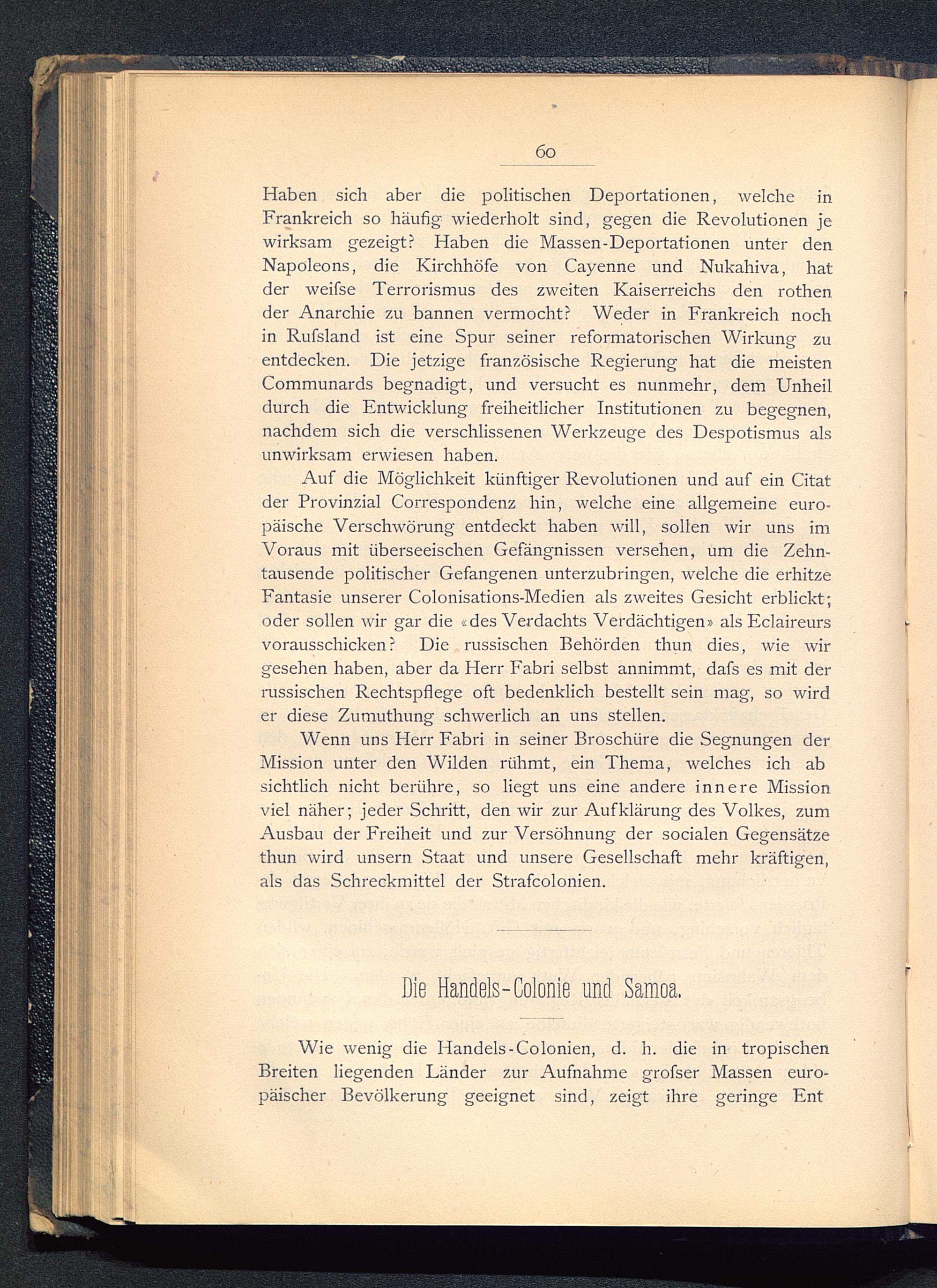 Wenn uns Herr Fabri in seiner Broschüre die Segnungen derMission unter den Wilden rühmt, ein Thema, welches ich absichtlich nicht berühre, so liegt uns eine andere innere Missionviel näher; jeder Schritt, den wir zur Aufklärung des Volkes, zumAusbau der Freiheit und zur Versöhnung der socialen Gegensätzethun wird unsern Staat und unsere Gesellschaft mehr kräftigen,als das Schreckmittel der Strafcolonien.