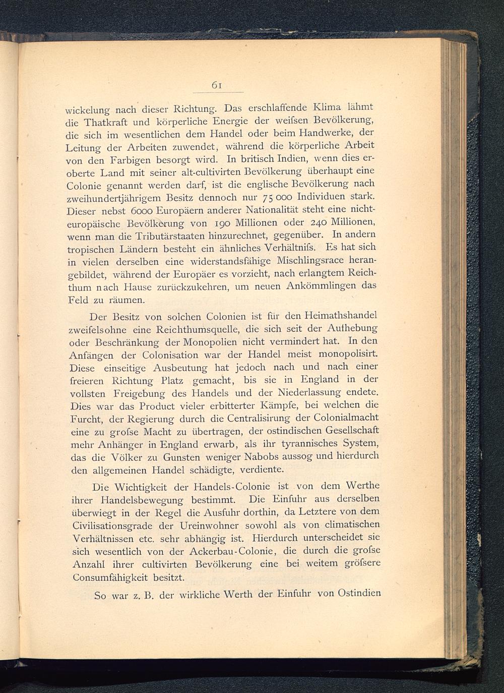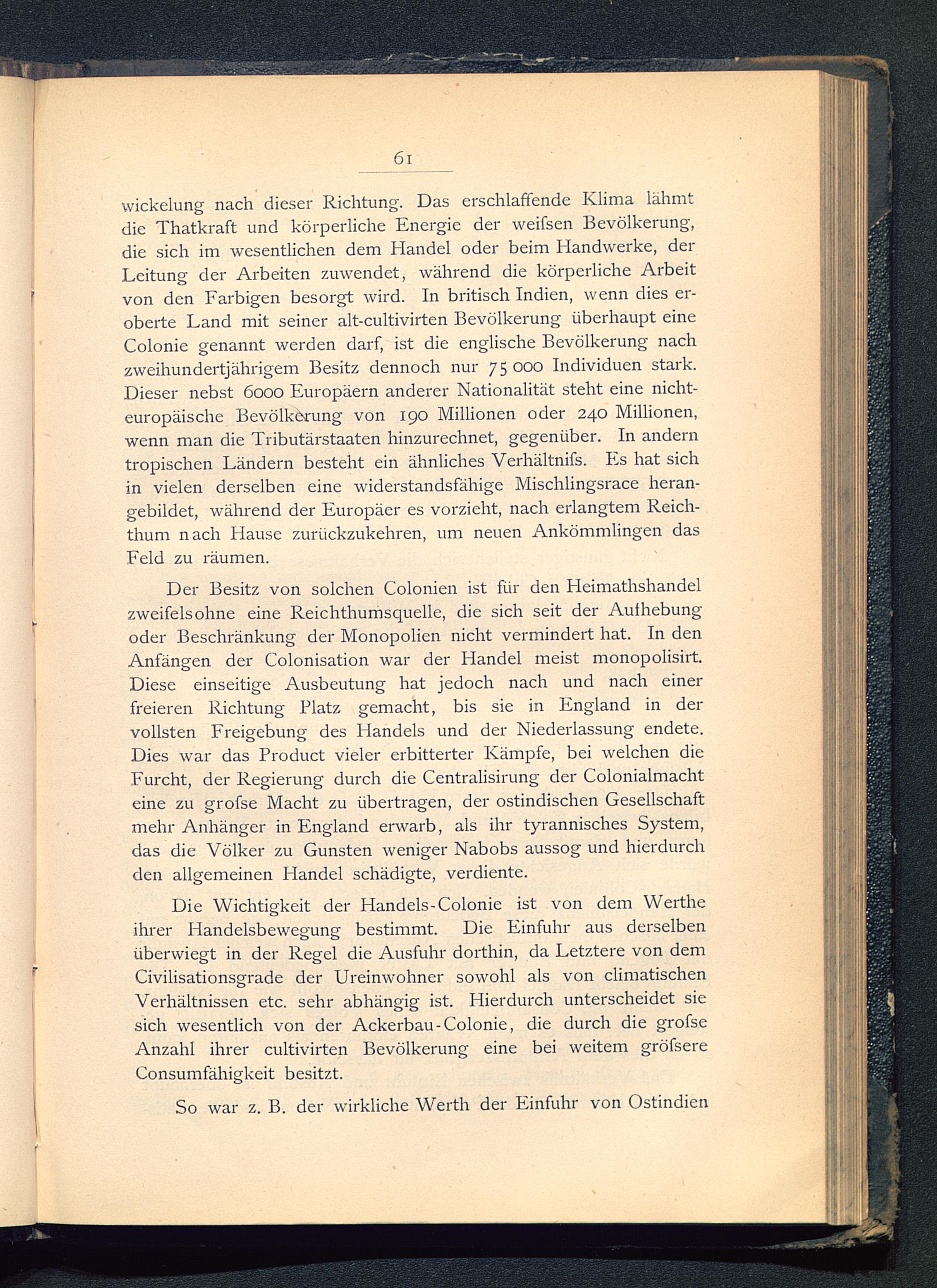 Wickelung nach dieser Richtung. Das erschlaffende Klima lähmtdie Thatkraft und körperliche Energie der weifsen Bevölkerung,die sich im wesentlichen dem Handel oder beim Handwerke, derLeitung der Arbeiten zuwendet, während die körperliche Arbeitvon den Farbigen besorgt wird. In britisch Indien, wenn dies er-oberte Land mit seiner alt-cultivirten Bevölkerung überhaupt eineColonie genannt werden darf, ist die englische Bevölkerung nachzweihundertjährigem Besitz dennoch nur 75 000 Individuen stark.Dieser nebst 6000 Europäern anderer Nationalität steht eine nicht-europäische Bevölkerung von 190 Millionen oder 240 Millionen,wenn man die Tributärstaaten hinzurechnet, gegenüber. In anderntropischen Ländern besteht ein ähnliches Verhältnifs. Es hat sichin vielen derselben eine widerstandsfähige Mischlingsrace heran-gebildet, während der Europäer es vorzieht, nach erlangtem Reich-thum nach Hause zurückzukehren, um neuen Ankömmlingen dasFeld zu räumen.