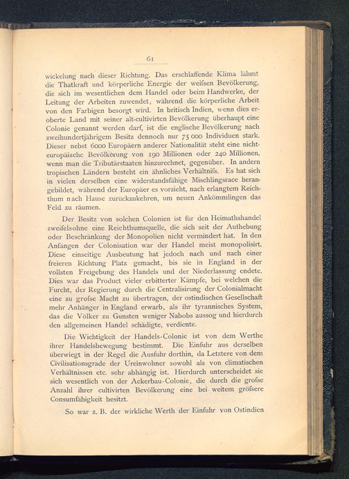 Die Wichtigkeit der Handels-Colonie ist von dem Wertheihrer Handelsbewegung bestimmt. Die Einfuhr aus derselbenüberwiegt in der Regel die Ausfuhr dorthin, da Letztere von demCivilisationsgrade der Ureinwohner sowohl als von climatischenVerhältnissen etc. sehr abhängig ist. Hierdurch unterscheidet siesich wesentlich von der Ackerbau-Colonie, die durch die grofseAnzahl ihrer cultivirten Bevölkerung eine bei weitem gröfsereConsumfähigkeit besitzt.
