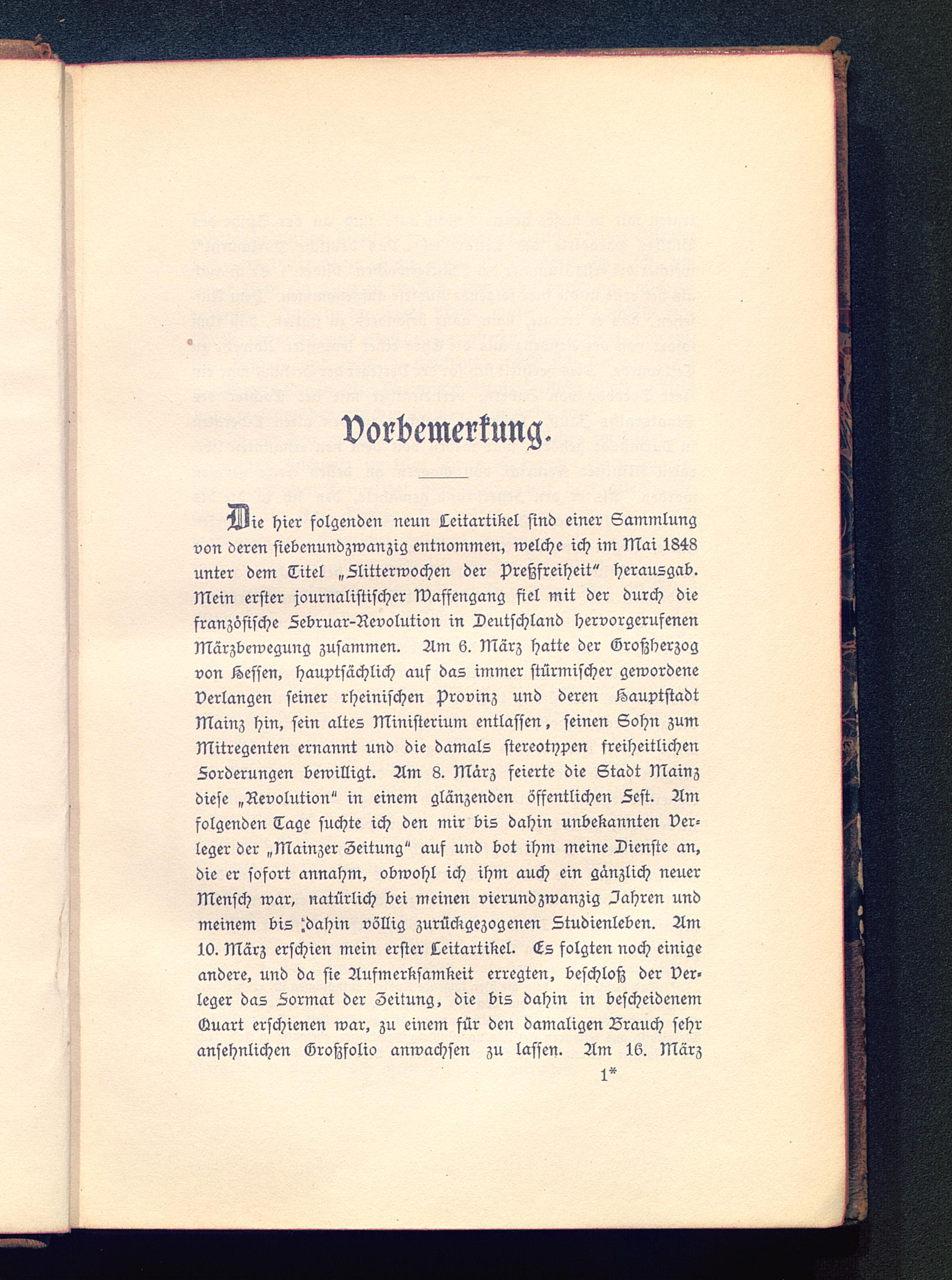 53ie hier folgenden neun Leitartikel sind einer Sammlungvon deren siebenundzwanzig entnommen, welche ich im Mai 1848unter dem Titel „Llitterwochen der Preßfreiheit" herausgab.Mein erster journalistischer Waffengang fiel mit der durch diefranzösische Lebruar-Revolution in Deutschland hervorgerufenenMärzbewegung zusammen. Am 6. März hatte der Großherzogvon Hessen , hauptsächlich auf das immer stürmischer gewordeneverlangen seiner rheinischen Provinz und deren HauptstadtMainz hin, sein altes Ministerium entlassen, seinen Sohn zumMitregenten ernannt und die damals stereotypen freiheitlichenForderungen bewilligt. Am 8. März feierte die Stadt Mainz diese „Revolution" in einem glänzenden öffentlichen Lest. Amfolgenden Tage suchte ich den mir bis dahin unbekannten Ver-leger der „Mainzer Zeitung" auf und bot ihm meine Dienste an,die er sofort annahm, obwohl ich ihm auch ein gänzlich neuerMensch war, natürlich bei meinen vierundzwanzig Jahren undmeinem bis Hahin völlig zurückgezogenen Studienleben. Am10. März erschien mein erster Leitartikel. Cs folgten noch einigeandere, und da sie Aufmerksamkeit erregten, beschloß der Ver-leger das Lormat der Zeitung, die bis dahin in bescheidenemGuart erschienen war, zu einem für den damaligen Brauch sehransehnlichen Großfolio anwachsen zu lassen. Am 1ö. März