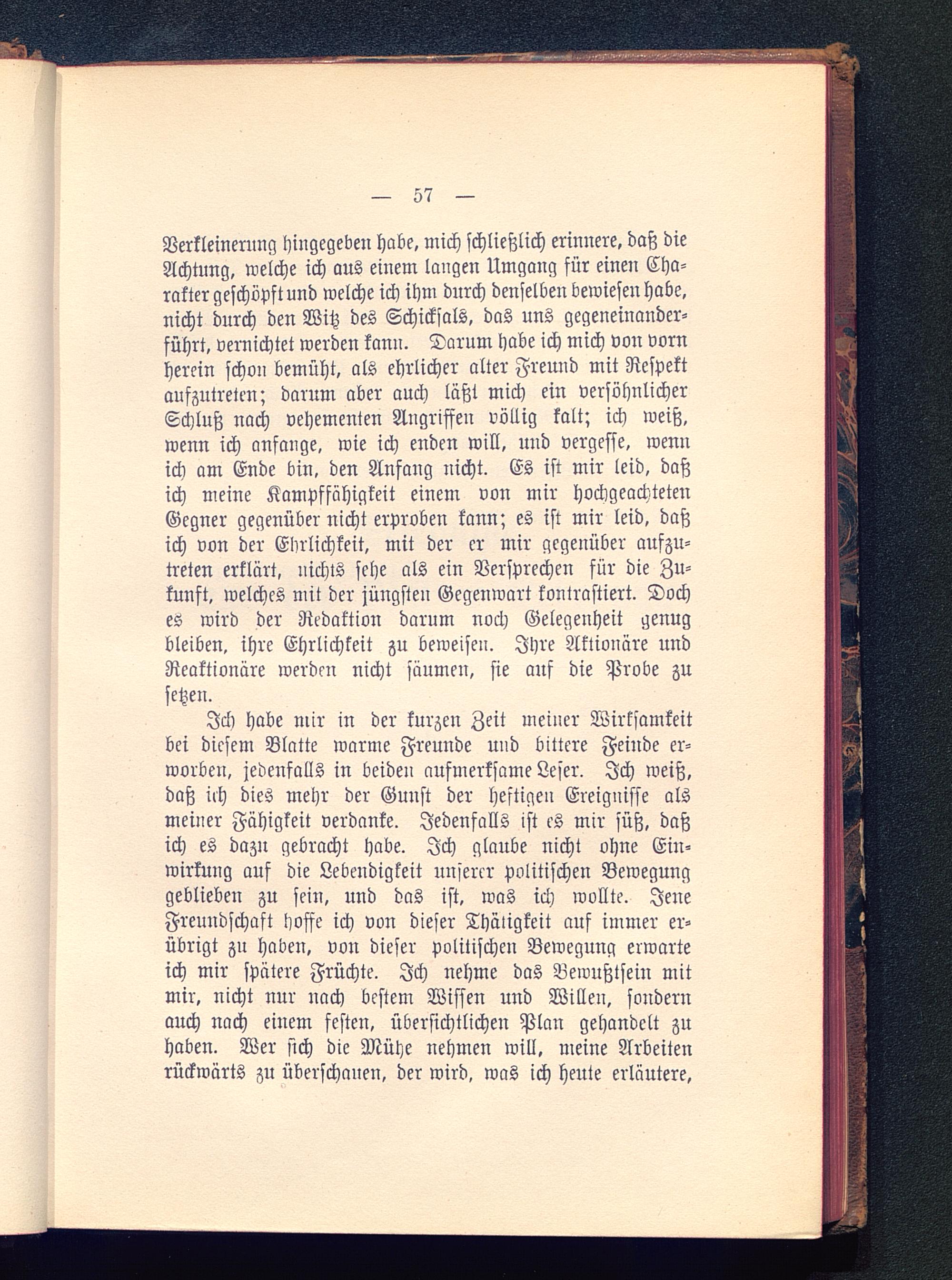 Ich habe mir in der kurzen Zeit meiner Wirksamkeitbei diesem Blatte warme Freunde und bittere Feinde er-worben, jedenfalls in beiden aufmerksame Leser. Ich weiß,daß ich dies mehr der Gunst der heftigen Ereignisse alsmeiner Fähigkeit verdanke. Jedenfalls ist es mir süß, daßich es dazu gebracht habe. Ich glaube nicht ohne Ein-wirkung auf die Lebendigkeit unserer politischen Bewegunggeblieben zu sein, und das ist, was ich wollte. JeneFreundschaft hoffe ich von dieser Thätigkeit auf immer er-übrigt zu haben, von dieser politischen Bewegung erwarteich mir spätere Früchte. Ich nehme das Bewußtsein mitmir, nicht nur nach bestem Wissen und Willen, sondernauch nach einem festen, übersichtlichen Plan gehandelt zuhaben. Wer sich die Mühe nehmen will, meine Arbeitenrückwärts zu überschauen, der wird, was ich heute erläutere,