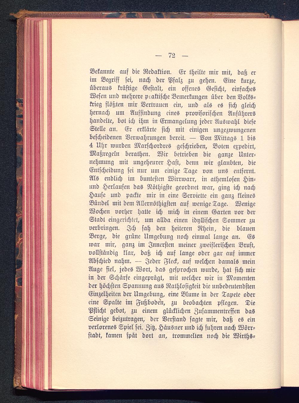 Bekannte auf die Redaktion. Er theilte mir mit, daß erim Begriff sei, nach der Pfalz zu gehen. Eine kurze,überaus kräftige Gestalt, ein offenes Gesicht, einfachesWesen und mehrere praktische Bemerkungen über den Volks-krieg flößten mir Vertrauen ein, und als es sich gleichhernach um Auffindung eines provisorischen Anführershandelte, bot ich ihm in Ermangelung jeder Auswahl dieseStelle an. Er erklärte sich mit einigen ungezwungenenbescheidenen Verwahrungen bereit. — Von Mittags 1 bis4 Uhr wurden Marschordres geschrieben, Boten expedirt,Maßregeln berathen. Wir betrieben die ganze Unter-nehmung mit ungeheurer Hast, denn wir glaubten, dieEntscheidung sei nur um einige Tage von uns entfernt.Als endlich im buntesten Wirrwarr, in athemlosen Hin-und Herlaufen das Nöthigste geordnet war, ging ich nachHanse und packte mir in eine Serviette ein ganz kleinesBündel mit dem Allernöthigsten auf wenige Tage. WenigeWochen vorher hatte ich mich in einem Garten vor derStadt eingerichtet, um allda einen idyllischen Sommer zuverbringen. Ich sah den heiteren Rhein , die blauenBerge, die grüne Umgebung noch einmal lange an. Eswar mir, ganz im Innersten meiner zweiflerischen Brust,vollständig klar, daß ich auf lange oder gar auf immerAbschied nahm. — Jeder Fleck, auf welchen damals meinAuge fiel, jedes Wort, das gesprochen wurde, hat sich mirin der Schärfe eingeprägt, mit welcher wir in Momentender höchsten Spannung aus Rathlosigkeit die unbedeutendstenEinzelheiten der Umgebung, eine Blume in der Tapete odereine Spalte im Fußboden, zu beobachten pflegen. DiePflicht gebot, zu einem glücklichen Zusammentreffen dasSeinige beizutragen, der Verstand sagte mir, daß es einverlorenes Spiel sei. Zitz, Häusner und ich fuhren nach Wörr-stadt, kamen spät dort an, trommelten noch die Wirths-