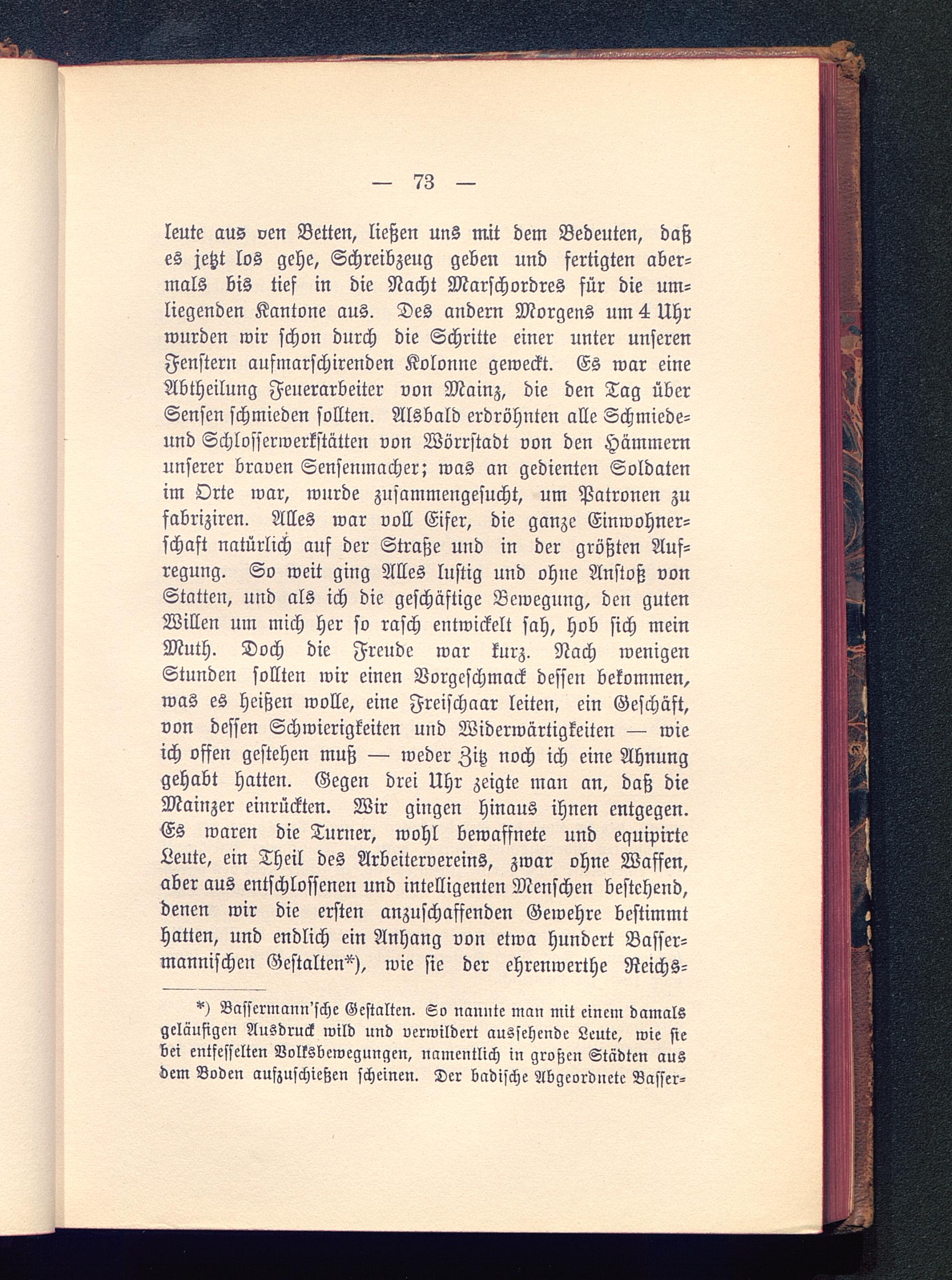 leute aus ven Betten, ließen uns mit dem Bedeuten, daßes jetzt los gehe, Schreibzeug geben und fertigten aber-mals bis tief in die Nacht Marschordres für die um-liegenden Kantone aus. Des andern Morgens um 4 Uhrwurden wir schon durch die Schritte einer unter unserenFenstern aufmarschirenden Kolonne geweckt. Es war eineAbtheilung Feuerarbeiter von Mainz , die den Tag überSensen schmieden sollten. Alsbald erdröhnten alle Schmiede-und Schlosserwerkstätten von Wörrstadt von den Hämmernunserer braven Sensenmacher; was an gedienten Soldatenim Orte war, wnrde zusammengesucht, um Patronen zufabriziren. Alles war voll Eifer, die ganze Einwohner-schaft natürlich auf der Straße und in der größten Auf-regung. So weit ging Alles lustig und ohne Anstoß vonStatten, und als ich die geschäftige Bewegung, den gutenWillen um mich her so rasch entwickelt sah, hob sich meinMuth. Doch die Freude war kurz. Nach wenigenStunden sollten wir einen Vorgeschmack dessen bekommen,was es heißen wolle, eine Freischaar leiten, ein Geschäft,von dessen Schwierigkeiten und Widerwärtigkeiten — wieich offen gestehen muß — weder Zitz noch ich eine Ahnunggehabt hatten. Gegen drei Uhr zeigte man an, daß dieMainzer einrückten. Wir gingen hinaus ihnen entgegen.Es waren die Turner, wohl bewaffnete und equipirtcLeute, ein Theil des Arbeitervereins, zwar ohne Waffen,aber aus entschlossenen und intelligenten Menschen bestehend,denen wir die ersten anzuschaffenden Gewehre bestimmthatten, und endlich ein Anhang von etwa hundert Basser-mannischen Gestalten"), wie sie der ehrenwerthe Reichs-