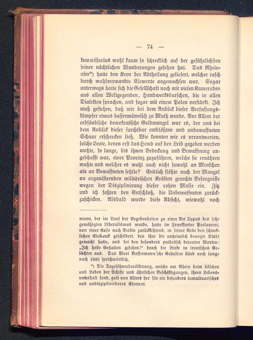 kommissarius wohl kaum so schrecklich auf der gefährlichstenseiner nächtlichen Wanderungen gesehen hat. Das Rhein-ufer*) hatte den Kern der Abtheilung geliefert, welcher raschdurch wahlverwandte Elemente angewachsen war. Sogarunterwegs hatte sich die Gesellschaft noch mit vielen Kameradenaus allen Weltgegenden, Handwerksburschen, die in allenDialekten sprachen, und sogar mit einem Polen verstärkt. Ichmuß gestehen, daß mir bei dem Anblick dieser Verfasfungs-kämvfer etwas bassermännisch zu Muth wurde. Vor Allem dererbsündliche demokratische Geldmangel war es, der uns beidem Anblick dieser furchtbar entblößten und unbewaffnetenSchaar erschrecken ließ. Wie konnten wir es verantworten,solche Leute, denen erst das Hemd auf den Leib gegeben werdenmußte, so lange, bis ihnen Bedeckung und Bewaffnung an-geschafft war, einer Provinz zuzuführen, welche sie ernährenmußte und welcher es wohl auch nicht sowohl an Menschenals an Bewaffneten fehlte? Endlich flößte auch der Mangelan organisirenden militärischen Kräften gerechte Besorgnissewegen der Diszivlinirung dieser rohen Masse ein. Zitzund ich faßten den Entschluß, die Unbewaffneten zurück-zuschicken. Alsbald wurde diese Absicht, wiewohl noch