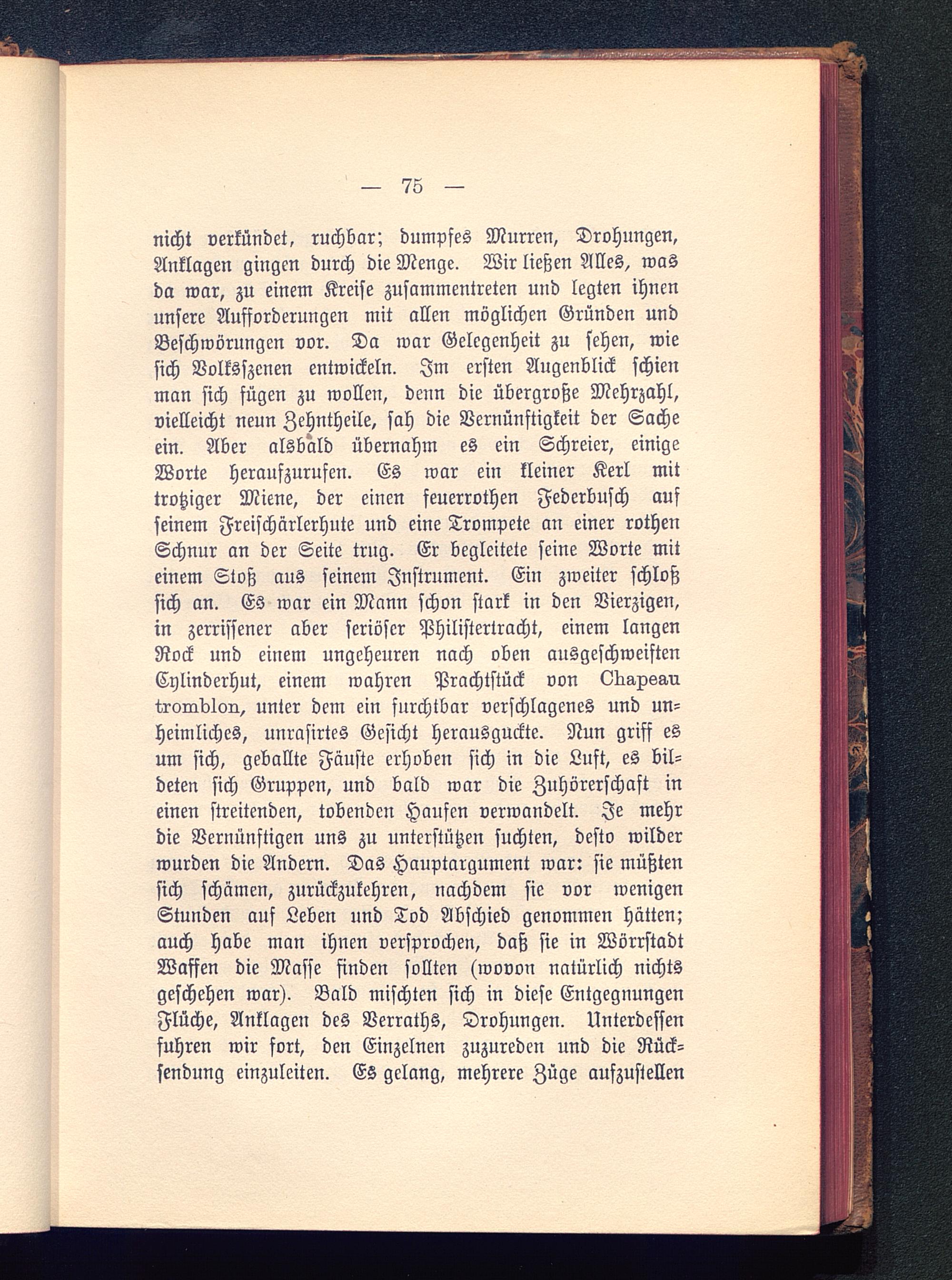 nicht verkündet, ruchbar; dumpfes Murren, Drohungen,Anklagen gingen durch die Menge. Wir ließen Alles, wasda war, zu einem Kreise zusammentreten uud legten ihnenunsere Aufforderungen mit allen möglichen Gründen undBeschwörungen vor. Da war Gelegenheit zu sehen, wiesich Volksszenen entwickeln. Im ersten Augenblick schienman sich fügen zu wollen, denn die übergroße Mehrzahl,vielleicht neun Zehntheile, sah die Vernünftigkeit der Sacheein. Aber alsbald übernahm es ein Schreier, einigeWorte heraufzurufen. Es war ein kleiner Kerl mittrotziger Miene, der einen feuerrothen Federbusch aufseinem Freischärlerhute und eine Trompete an einer rothenSchnur an der Seite trug. Er begleitete seine Worte miteinem Stoß aus seinem Instrument. Ein zweiter schloßsich an. Es war ein Mann schon stark in den Vierzigen,in zerrissener aber seriöser Philistertracht, einem langenRock und einem ungeheuren nach oben ausgeschweiftenCylinderhut, einem wahren Prachtstück von Lüiaxsautronadlon, unter dem ein furchtbar verschlagenes und un-heimliches, unrasirtes Gesicht herausguckte. Nun griff esum sich, geballte Fäuste erhoben sich in die Luft, es bil-deten sich Gruppen, und bald war die Zuhörerschaft ineinen streitenden, tobenden Haufen verwandelt. Je mehrdie Vernünftigen uns zu unterstützen suchten, desto wilderwurden die Andern. Das Hauptargument war: sie müßtensich schämen, zurückzukehren, nachdem sie vor wenigenStunden auf Leben und Tod Abschied genommen hätten;auch habe man ihnen versprochen, daß sie in WörrstadtWaffen die Masse finden sollten (wovon natürlich nichtsgeschehen war). Bald mischten sich in diese EntgegnungenFlüche, Anklagen des Verraths, Drohungen. Unterdessenfuhren wir fort, den Einzelnen zuzureden und die Rück-sendung einzuleiten. Es gelang, mehrere Züge aufzustellen