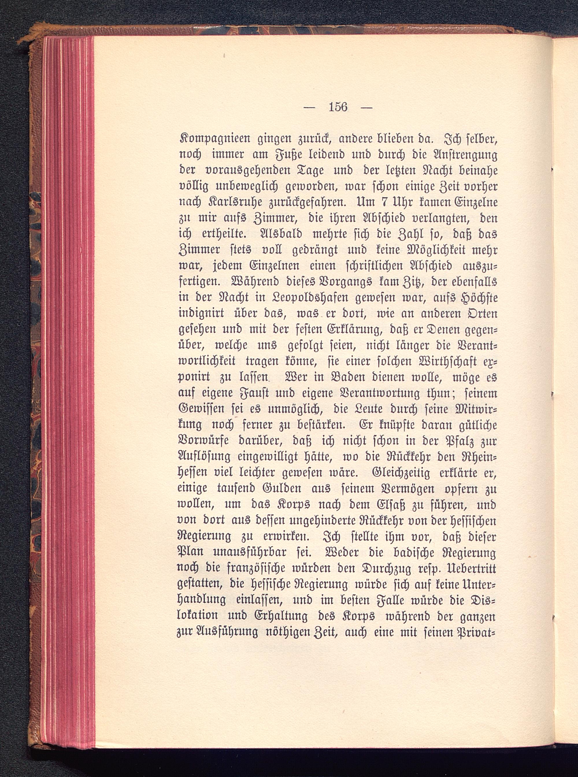 Kompagnieen gingen zurück, andere blieben da. Ich selber,noch immer am Fuße leidend und durch die Anstrengungder vorausgehenden Tage und der letzten Nacht beinahevöllig unbeweglich geworden, war schon einige Zeit vorhernach Karlsruhe zurückgefahren. Um 7 Uhr kamen Einzelnezu mir aufs Zimmer, die ihren Abschied verlangten, denich ertheilte. Alsbald mehrte sich die Zahl so, daß dasZimmer stets voll gedrängt uud keine Möglichkeit mehrwar, jedem Einzelnen einen schriftlichen Abschied auszu-fertigen. Während dieses Vorgangs kam Zitz, der ebenfallsin der Nacht in Leopoldshafen gewesen war, aufs Höchsteindignirt über das, was er dort, wie an anderen Ortengesehen und mit der festen Erklärung, daß er Denen gegen-über, welche uns gefolgt seien, nicht länger die Verant-wortlichkeit tragen könne, sie einer solchen Wirthschaft ex-ponirt zu lassen Wer in Baden dienen wolle, möge esauf eigene Faust und eigene Verantwortung thun; seinemGewissen sei es unmöglich, die Leute durch seine Mitwir-kung noch ferner zu bestärken. Er knüpfte daran gütlicheVorwürfe darüber, daß ich nicht schon in der Pfalz zurAuflösung eingewilligt hätte, wo die Rückkehr den Rhein-hessen viel leichter gewesen wäre. Gleichzeitig erklärte er,einige tausend Gulden aus seinem Vermögen opfern zuwollen, um das Korps nach dem Elsaß zu führen, undvon dort aus dessen ungehinderte Rückkehr von der hessischenRegierung zu erwirken. Ich stellte ihm vor, daß dieserPlan unausführbar sei. Weder die badische Regierungnoch die französische würden den Durchzug resp. Uebertrittgestatten, die hessische Regierung würde sich auf keine Unter-handlung einlassen, und im besten Falle würde die Dis-lokation und Erhaltung des Korps während der ganzenzur Ausführung nöthigen Zeit, auch eine mit seinen Privat-