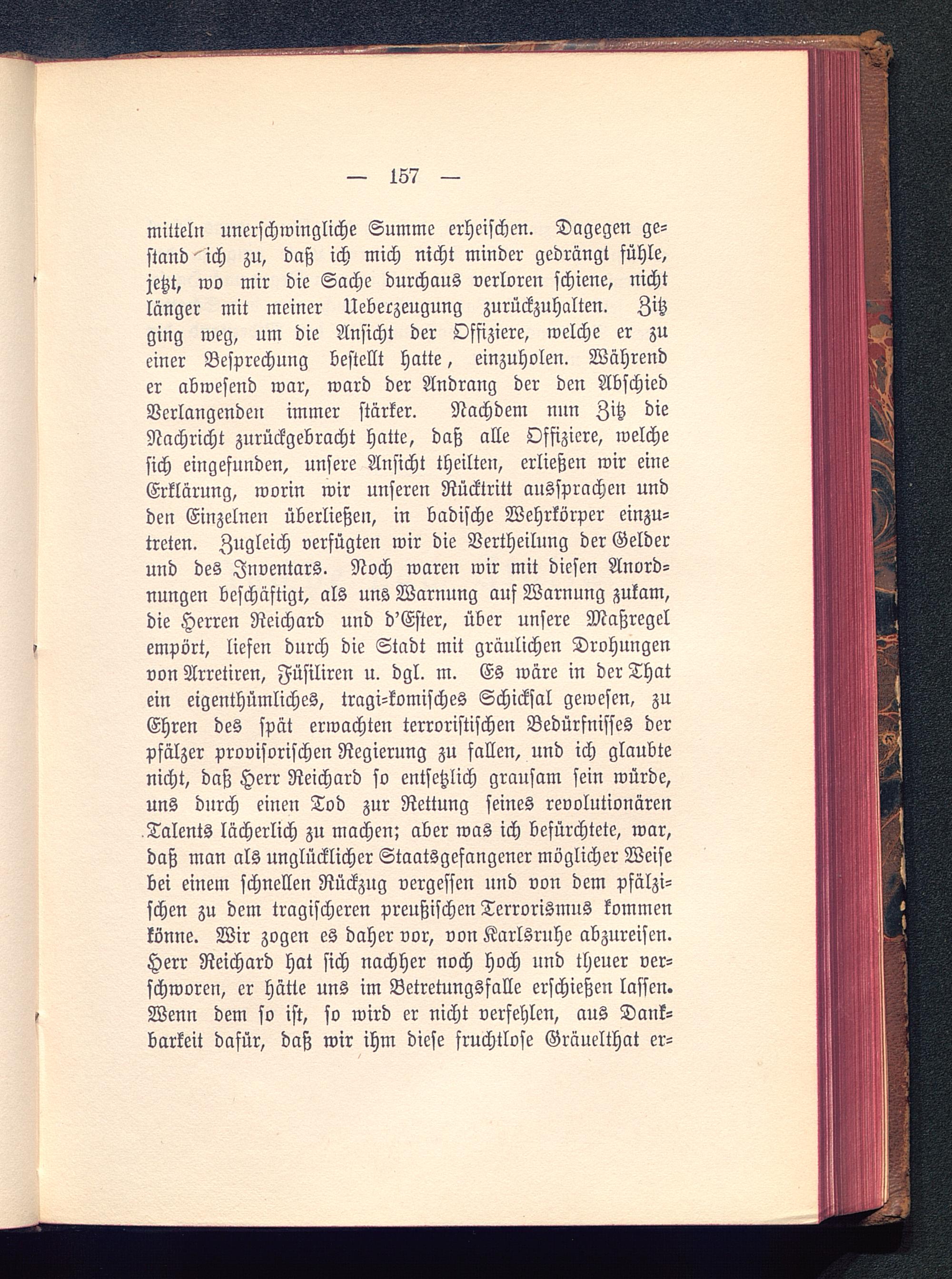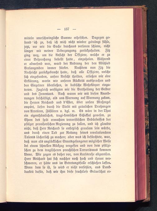 Mitteln unerschwingliche Summe erheischen. Dagegen ge-stand''ich zu, daß ich mich nicht minder gedrängt fühle,jetzt, wo mir die Sache durchaus verloren schiene, nichtlänger mit meiner Ueberzeugung zurückzuhalten. Zitzging weg, um die Ansicht der Offiziere, welche er zueiner Besprechung bestellt hatte, einzuholen. Währender abwesend war, ward der Andrang der den AbschiedVerlangenden immer stärker. Nachdem nun Zitz dieNachricht zurückgebracht hatte, daß alle Offiziere, welchesich eingefunden, unsere Ansicht theilten, erließen wir eineErklärung, worin wir unseren Rücktritt aussvrachen undden Einzelnen überließen, in badische Wehrkörper einzu-treten. Zugleich verfügten wir die Vertheilung der Gelderund des Inventars. Noch waren wir mit diesen Anord-nungen beschäftigt, als uns Warnung auf Warnung zukam,die Herren Reichard und d'Ester , über unsere Maßregelempört, liefen durch die Stadt mit gräulichen Drohungenvon Arretiren, Füsiliren u. dgl. m. Es wäre in der Thatein eigenthümliches, tragi-komisches Schicksal gewesen, zuEhren des spät erwachten terroristischen Bedürfnisfes derpfälzer provisorischen Regierung zu fallen, und ich glaubtenicht, daß Herr Reichard so entsetzlich grausam sein würde,uns durch einen Tod zur Rettung seines revolutionärenTalents lächerlich zu machen; aber was ich befürchtete, war,daß man als unglücklicher Staatsgefangener möglicher Weisebei einem schnellen Rückzug vergessen und von dem pfälzi-schen zu dem tragischeren preußischen Terrorismns kommenkönne. Wir zogen es daher vor, von Karlsruhe abzureisen.Herr Reichard hat sich nachher noch hoch und theuer ver-schworen, er hätte uns im Betretungsfalle erschießen lassen.Wenn dem so ist, so wird er nicht verfehlen, aus Dank-barkeit dafür, daß wir ihm diese fruchtlose Gräuelthat er-