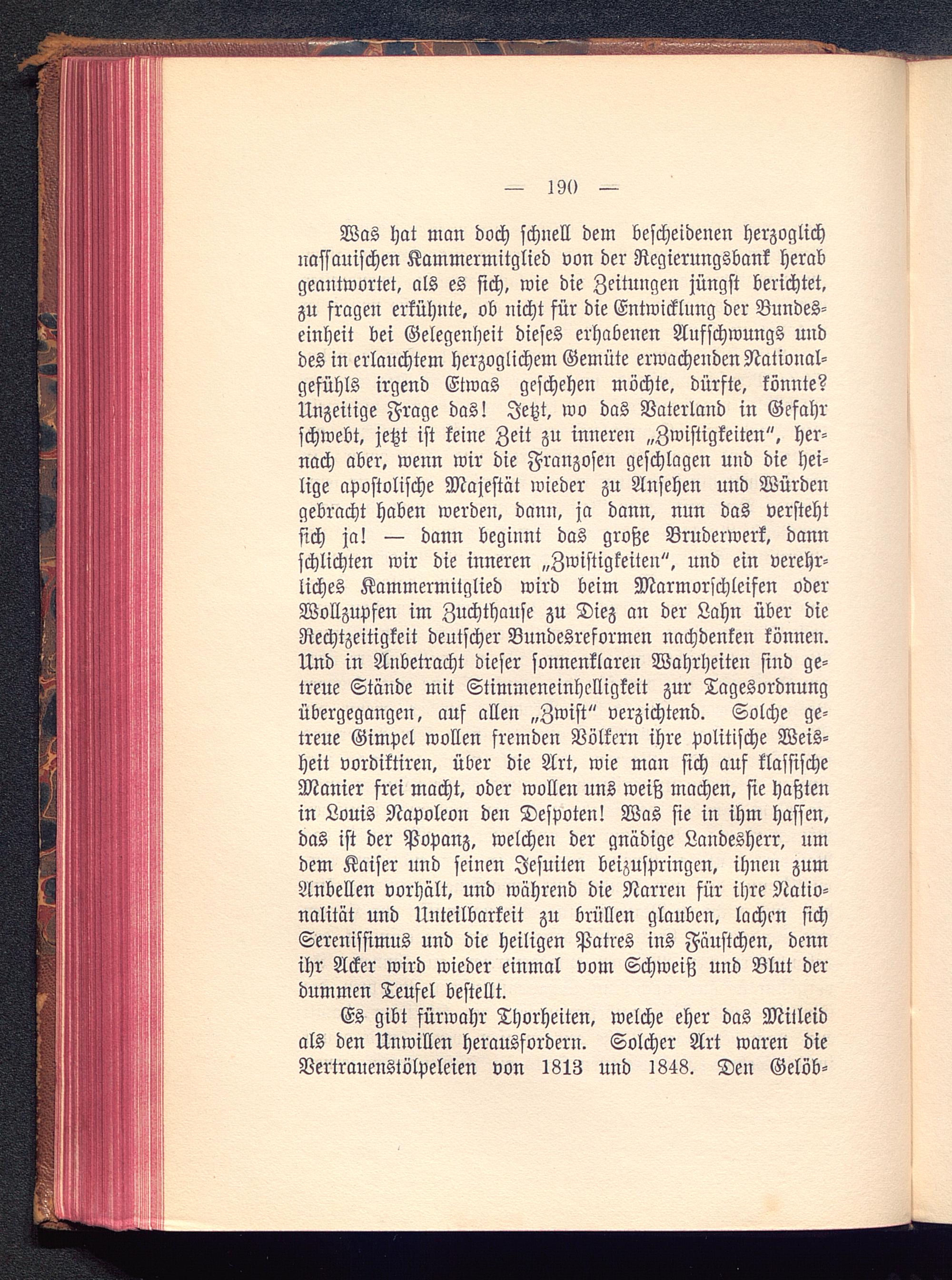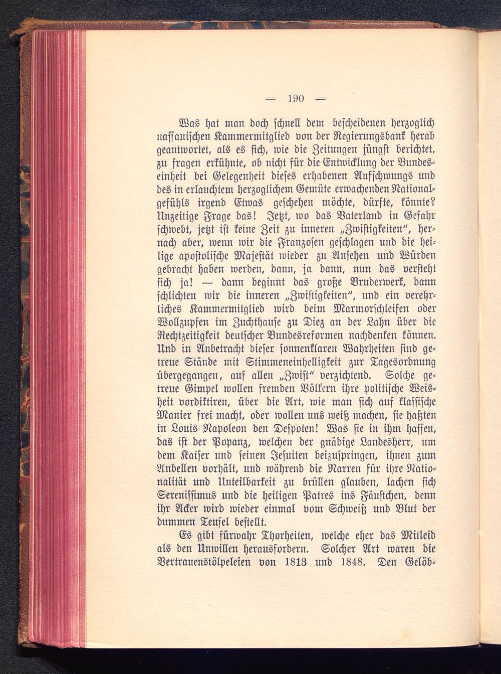 Was hat man doch schnell dem bescheidenen herzoglichnassauischen Kammermitglied von der Regierungsbank herabgeantwortet, als es sich, wie die Zeitungen jüngst berichtet,zu fragen erkühnte, ob nicht für die Entwicklung der Bundes-einheit bei Gelegenheit dieses erhabenen Aufschwungs unddes in erlauchtem herzoglichem Gemüte erwachenden National-gefühls irgend Etwas geschehen möchte, dürfte, könnte?Unzeitige Frage das! Jetzt, wo das Vaterland in Gefahrschwebt, jetzt ist keine Zeit zu inneren „Zwistigkeiten", her-nach aber, wenn wir die Franzosen geschlagen und die hei-lige apostolische Majestät wieder zu Ansehen und Würdengebracht haben werden, dann, ja dann, nun das verstehtsich ja! — dann beginnt das große Bruderwerk, dannschlichten wir die inneren „Zwistigkeiten", und ein verehr-liches Kammermitglied wird beim Marmorschleifen oderWollzupfen im Zuchthause zu Diez an der Lahn über dieRechtzeitigkeit deutscher Bundesreformen nachdenken können.Und in Anbetracht dieser sonnenklaren Wahrheiten sind ge-treue Stände mit Stimmeneinhclligkeit zur Tagesordnungübergegangen, auf allen „Zwist " verzichtend. Solche ge-treue Gimpel wollen fremden Völkern ihre politische Weis-heit vordiktiren, über die Art, wie man sich auf klassischeManier frei macht, oder wollen uns weiß machen, sie haßtenin Louis Napoleon den Despoten! Was sie in ihm hassen,das ist der Popanz, welchen der gnädige Landesherr, umdem Kaiser und seinen Jesuiten beizuspringen, ihnen zumAnbellen vorhält, und während die Narren für ihre Natio-nalität und Unteilbarkeit zu brüllen glauben, lachen sichSerenissimus und die heiligen Patres ins Fäustchen, dennihr Acker wird wieder einmal vom Schweiß und Blut derdummen Teufel bestellt.