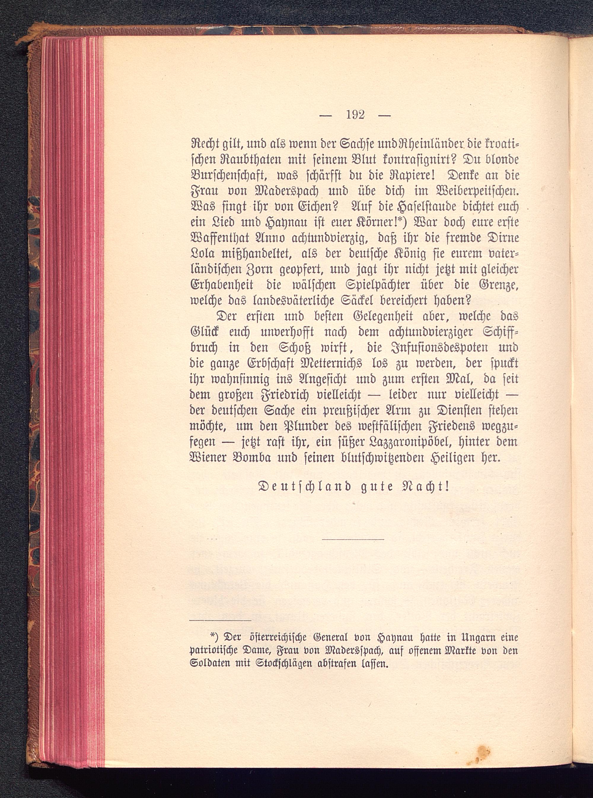 Recht gilt, und als wenn der Sachse und Rheinländer die kroati-schen Raubthaten mit seinem Blut kontrasignirt? Du blondeBurschenschaft , was schärfst du die Rapiere! Denke an dieFrau von Madersvach und übe dich im Weiberpeitschen.Was singt ihr von Eichen? Auf die Haselstaude dichtet euchein Lied und Haynau ist euer Körner!*) War doch eure ersteWaffenthat Anno achtundvierzig, daß ihr die fremde DirneLola mißhandeltet, als der deutsche König sie eurem vater-ländischen Zorn geopfert, und jagt ihr nicht jetzt mit gleicherErhabenheit die wälschen Spielpächter über die Grenze,welche das landesväterliche Säckel bereichert haben?