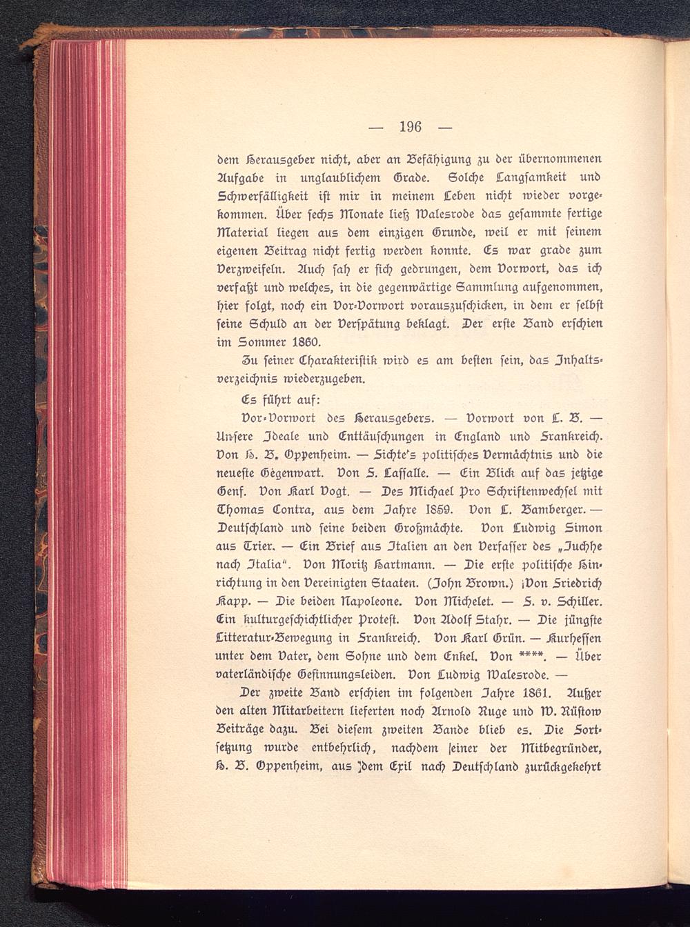 Der zweite Band erschien im folgenden Jahre 1861. Außerden alten Mitarbeitern lieferten noch Arnold Rüge und 1V. RüstowBeiträge dazu. Bei diesem zweiten Bande blieb es. Die Sort-setzung wurde entbehrlich, nachdem seiner der Mitbegründer.H. B. Gppenheim. aus ',dem Cril nach Deutschland zurückgekehrt