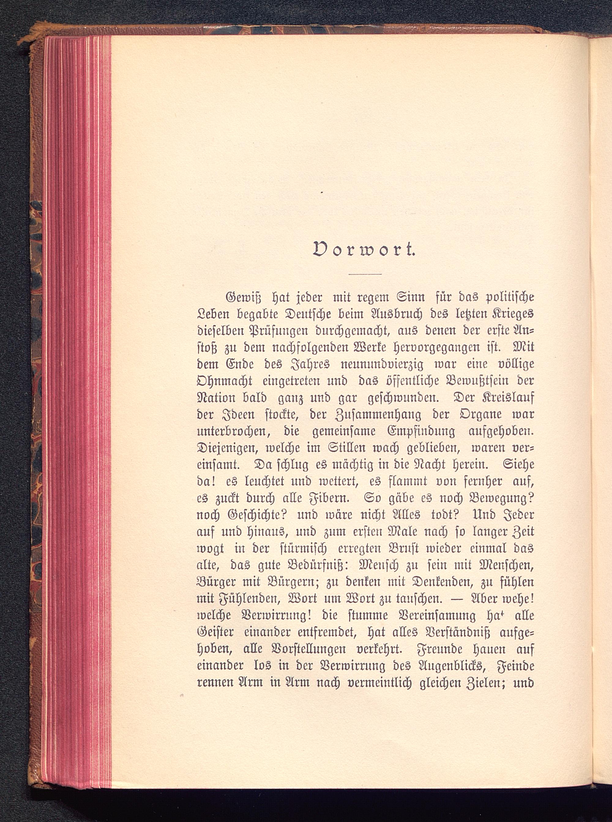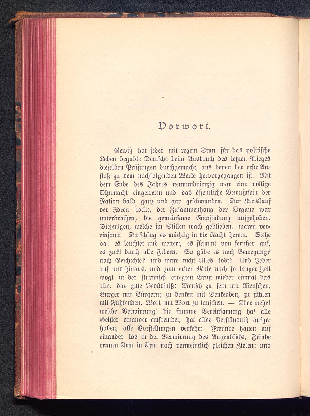Gewiß hat jeder mit regem Sinn für das politischeLeben begabte Deutsche beim Ausbruch des letzten Kriegesdieselben Prüfungen durchgemacht, aus denen der erste An-stoß zu dem nachfolgenden Werke hervorgegangen ist. Mitdem Ende des Jahres neunnndvierzig war eine völligeOhnmacht eingetreten und das öffentliche Bewußtsein derNation bald ganz und gar geschwunden. Der Kreislaufder Ideen stockte, der Zusammenhang der Organe warunterbrochen, die gemeinsame Empfindung aufgehoben.Diejenigen, welche im Stillen wach geblieben, waren ver-einsamt. Da schlug es mächtig in die Nacht herein. Sieheda! es leuchtet und wettert, es flammt von fernher auf,es zuckt durch alle Fibern. So gäbe es noch Bewegung?noch Geschichte? und wäre nicht Alles todt? Und Jederauf und hinaus, und zum ersten Male nach so langer Zeitwogt in der stürmisch erregten Brust wieder einmal dasalte, das gute Bedürfniß: Mensch zu sein mit Menschen,Bürger mit Bürgern; zu denken mit Denkenden, zn fühlenmit Fühlenden, Wort um Wort zu tauschen. — Aber wehe!welche Verwirrung! die stumme Vereinsamung ha^ alleGeister einander entfremdet, hat alles Verständniß aufge-hoben, alle Vorstellungen verkehrt. Freunde hauen aufeinander los in der Verwirrung des Augenblicks, Feinderennen Arm in Arm nach vermeintlich gleichen Zielen; und