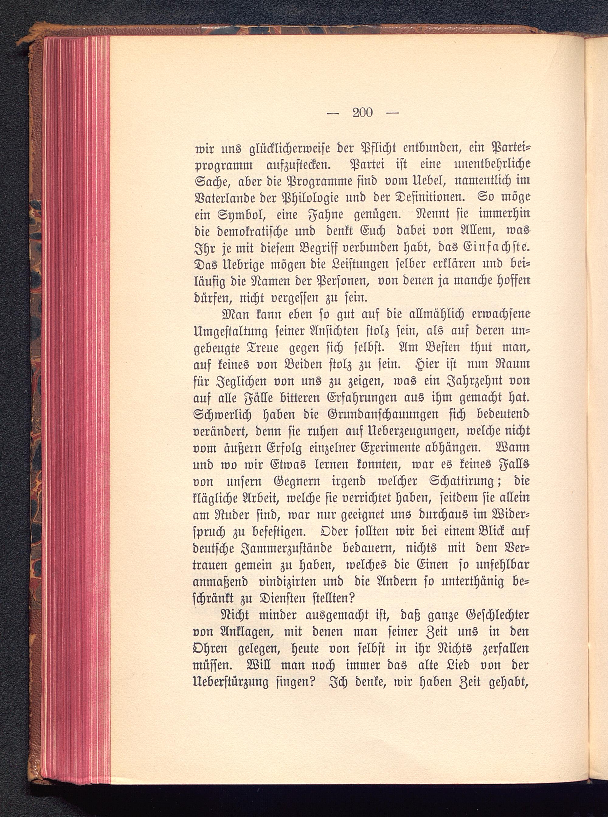 Man kann eben so gut auf die allmählich erwachseneUmgestaltung seiner Ansichten stolz sein, als auf deren un-gebeugte Treue gegen sich selbst. Am Besten thut man,auf keines von Beiden stolz zu sein. Hier ist nun Raumfür Jeglichen von uns zu zeigen, was ein Jahrzehnt vonauf alle Fälle bitteren Erfahrungen aus ihm gemacht hat.Schwerlich haben die Grundanschauungen sich bedeutendverändert, denn sie ruhen auf Ueberzeugungen, welche nichtvom äußern Erfolg einzelner Exerimente abhängen. Wannund wo wir Etwas lernen konnten, war es keines Fallsvon unsern Gegnern irgend welcher Schattirung; dieklägliche Arbeit, welche sie verrichtet haben, seitdem sie alleinam Ruder sind, war nur geeignet uns durchaus im Wider-spruch zu befestigen. Oder sollten wir bei einem Blick aufdeutsche Jammerzustände bedauern, nichts mit dem Ver-trauen gemein zu haben, welches die Einen so unfehlbaranmaßend vindizirten und die Andern so unterthänig be-schränkt zu Diensten stellten?