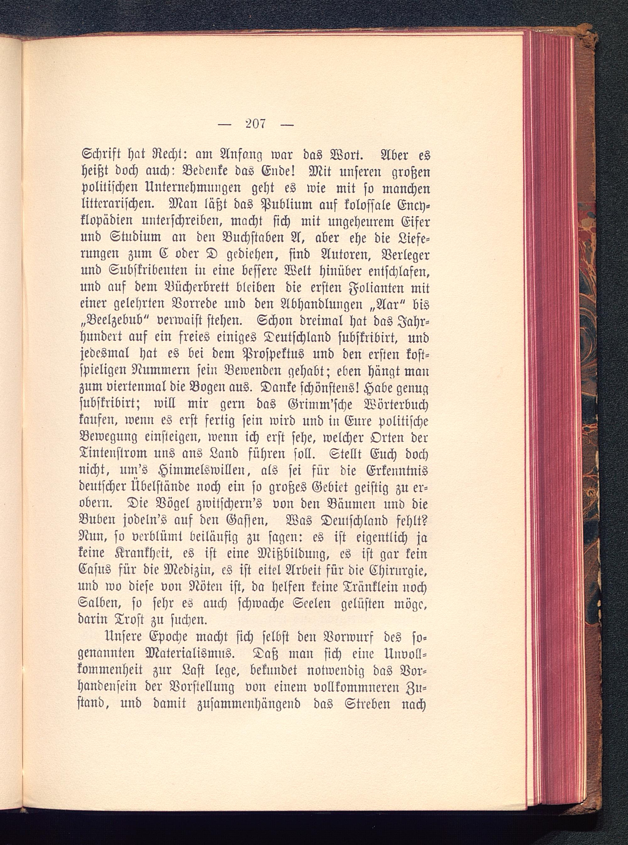 Schrift hat Recht: am Anfang war das Wort. Aber esheißt doch auch: Bedenke das Ende! Mit unseren großenpolitischen Unternehmungen geht es wie mit so manchenlitterarischen. Man läßt das Publium auf kolossale Ency-klopädien unterschreiben, macht sich mit ungeheurem Eiferund Studium an den Buchstaben A, aber ehe die Liefe-rungen zum C oder D gediehen, sind Autoren, Verlegerund Subskribenten in eine bessere Welt hinüber entschlafen,und auf dem Bücherbrett bleiben die ersten Folianten miteiner gelehrten Vorrede und den Abhandlungen „Aar" bis„Beelzebub" verwaist stehen. Schon dreimal hat das Jahr-hundert auf ein freies einiges Deutschland subskribirt, undjedesmal hat es bei dem Prospektus und den ersten kost-spieligen Nummern sein Bewenden gehabt; eben hängt manzum viertenmal die Bogen aus. Danke schönstens! Habe genugsubskribirt; will mir gern das Grimm'sche Wörterbuchkaufen, wenn es erst fertig sein wird und in Eure politischeBewegung einsteigen, wenn ich erst sehe, welcher Orten derTintenstrom uns ans Land führen soll. Stellt Euch dochnicht, um's Himmelswillen, als sei für die Erkenntnisdeutscher Übelstände noch ein so großes Gebiet geistig zu er-obern. Die Vögel zwitschern's von den Bäumen und dieBuben jodeln's auf den Gassen. Was Deutschland fehlt?Nun, so verblümt beiläufig zu sagen: es ist eigentlich jakeine Krankheit, es ist eine Mißbildung, es ist gar keinCasus für die Medizin, es ist eitel Arbeit für die Chirurgie,und wo diese von Nöten ist, da helfen keine Tränklein nochSalben, so sehr es auch schwache Seelen gelüsten möge,darin Trost zu suchen.