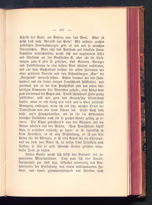 Unsere Epoche macht sich selbst den Vorwurf des so-genannten Materialismus. Daß man sich eine Unvoll-kommenheit zur Last lege, bekundet notwendig das Vor-handensein der Vorstellung von einem vollkommneren Zu-stand, und damit zusammenhängend das Streben nach