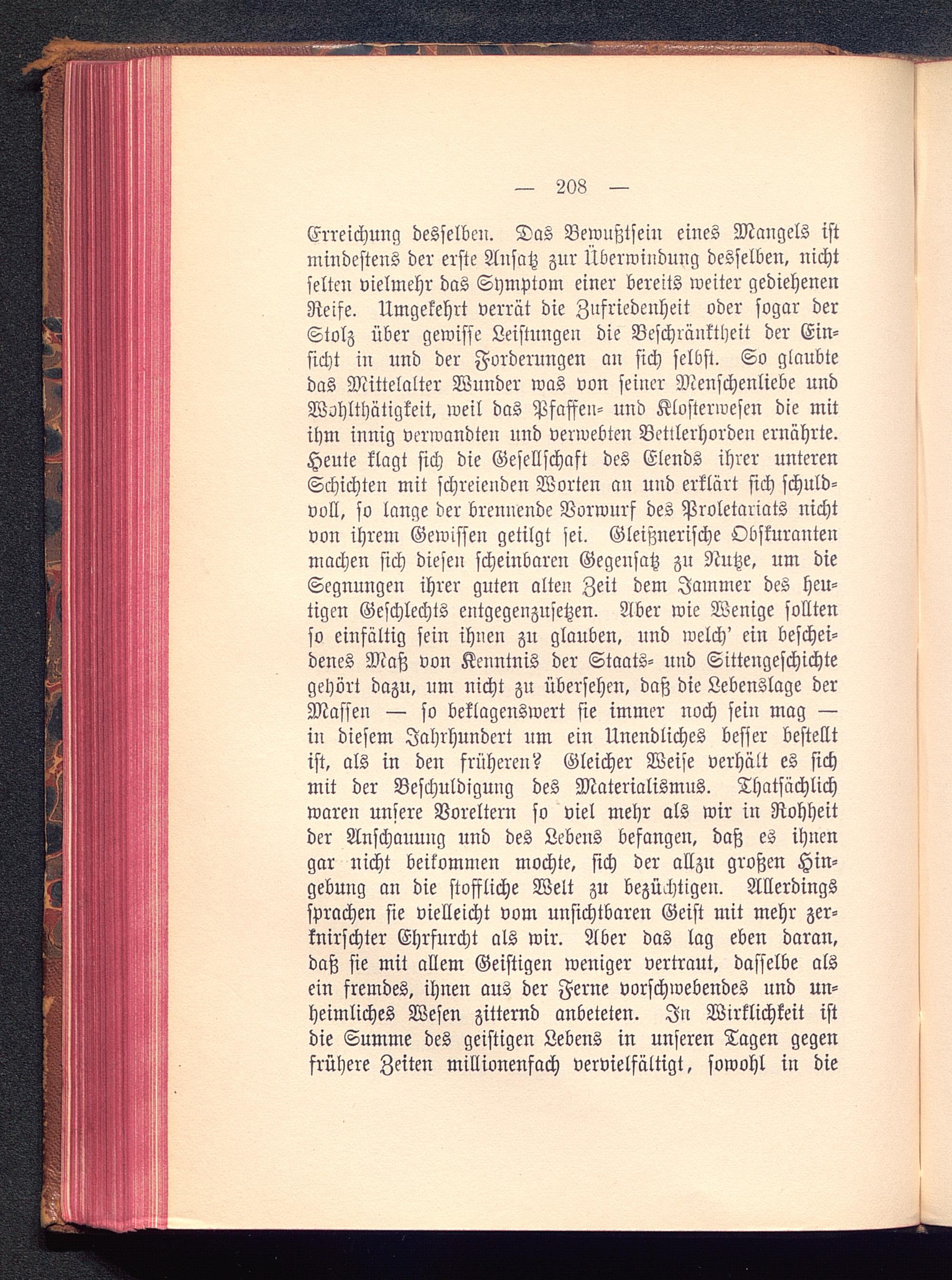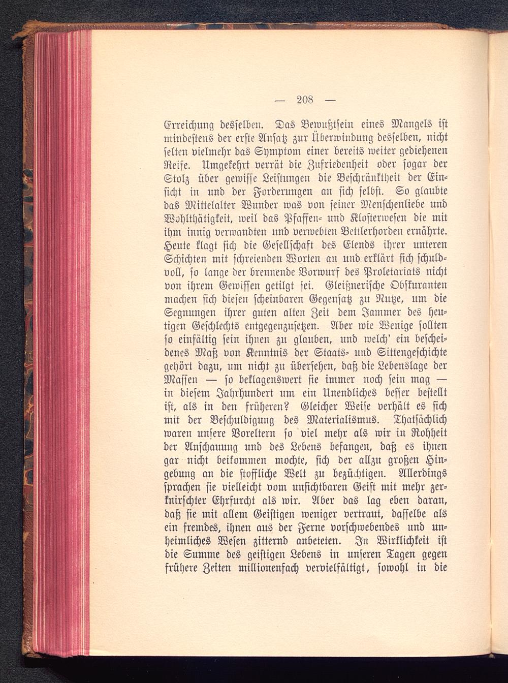 Erreichung desselben. Das Bewußtsein eines Mangels istmindestens der erste Ansatz zur Überwindung desselben, nichtselten vielmehr das Symptom einer bereits weiter gediehenenReife. Umgekehrt verrät die Zufriedenheit oder sogar derStolz über gewisse Leistungen die Beschränktheit der Ein-sicht in und der Forderungen an sich selbst. So glaubtedas Mittelalter Wunder was von seiner Menschenliebe undWohlthätigkeit, weil das Pfaffen- und Klosterwesen die mitihm innig verwandten und verwebten Betilerhorden ernährte.Heute klagt sich die Gesellschaft des Elends ihrer unterenSchichten mit schreienden Worten an und erklärt sich schuld-voll, so lange der brennende Vorwurf des Proletariats nichtvon ihrem Gewissen getilgt sei. Gleisznerische Obskurantenmachen sich diesen scheinbaren Gegensatz zu Nutze, um dieSegnungen ihrer guten alten Zeit dem Jammer des heu-tigen Geschlechts entgegenzusetzen. Aber wie Wenige solltenso einfältig sein ihnen zu glauben, und welch' ein beschei-denes Maß von Kenntnis der Staats- nnd Sittengeschichtegehört dazu, um nicht zu übersehen, daß die Lebenslage derMassen — so beklagenswert sie immer noch sein mag —in diesem Jahrhundert um ein Unendliches besser bestelltist, als in den früheren? Gleicher Weise verhält es sichmit der Beschuldigung des Materialismus. Thatsächlichwaren unsere Voreltern so viel mehr als wir in Rohheitder Anschauung und des Lebens befangen, daß es ihnengar nicht beikommen mochte, sich der allzu großen Hin-gebung an die stoffliche Welt zu bezüchtigen. Allerdingssprachen sie vielleicht vom unsichtbaren Geist mit mehr zer-knirschter Ehrfurcht als wir. Aber das lag eben daran,daß sie mit allem Geistigen weniger vertraut, dasselbe alsein fremdes, ihnen aus der Ferne vorschwebendes und un-heimliches Wesen zitternd anbeteten. In Wirklichkeit istdie Summe des geistigen Lebens in unseren Tagen gegenfrühere Zeiten millionenfach vervielfältigt, sowohl in die