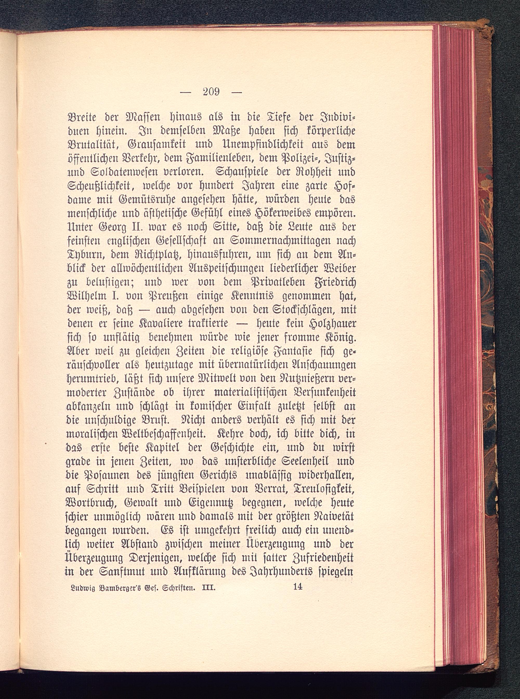 Breite der Massen hinaus als in die Tiefe der Indivi-duen hinein. In demselben Maße haben sich körperlicheBrutalität, Grausamkeit und Unempfindlichkeit aus demöffentlichen Verkehr, dem Familienleben, dem Polizei-, Justiz-und Soldatenwesen verloren. Schauspiele der Rohheit undScheußlichkeit, welche vor hundert Jahren eine zarte Hof-dame mit Gemütsruhe angesehen hätte, würden heute dasmenschliche und ästhetische Gefühl eines Hökerweibes empören.Unter Georg II, war es noch Sitte, daß die Leute aus derfeinsten englischen Gesellschaft an Sommernachmittagen nachTyburn, dem Richtplatz, hinausfuhren, um sich an dem An-blick der allwöchentlichen Auspeitschungen liederlicher Weiberzu belustigen; und wer von dem Privatleben FriedrichWilhelm I. von Preußen einige Kenntnis genommen hat,der weiß, daß — auch abgesehen von den Stockschlägen, mitdenen er seine Kavaliere traktierte — heute kein Holzhauersich so unflätig benehmen würde wie jener fromme König.Aber weil zu gleichen Zeiten die religiöse Fantasie sich ge-räuschvoller als heutzutage mit übernatürlichen Anschauungenherumtrieb, läßt sich unsere Mitwelt von den Nutznießern ver-moderter Zustände ob ihrer materialistischen Versunkenheitabkanzeln und schlägt in komischer Einfalt zuletzt selbst andie unschuldige Brust. Nicht anders verhält es sich mit dermoralischen Weltbeschaffeuheit. Kehre doch, ich bitte dich, indas erste beste Kapitel der Geschichte ein, und du wirstgrade in jenen Zeiten, wo das unsterbliche Seelenheil unddie Posaunen des jüngsten Gerichts unablässig widerhallen,auf Schritt und Tritt Beispielen von Verrat, Treulosigkeit,Wortbruch. Gewalt und Eigennutz begegnen, welche heuteschier unmöglich wären und damals mit der größten Naivetätbegangen wurden. Es ist umgekehrt freilich auch ein unend-lich weiter Abstand zwischen meiner Überzeugung und derÜberzeugung Derjenigen, welche sich mit satter Zufriedenheitin der Sanftmut und Aufklärung des Jahrhunderts spiegeln