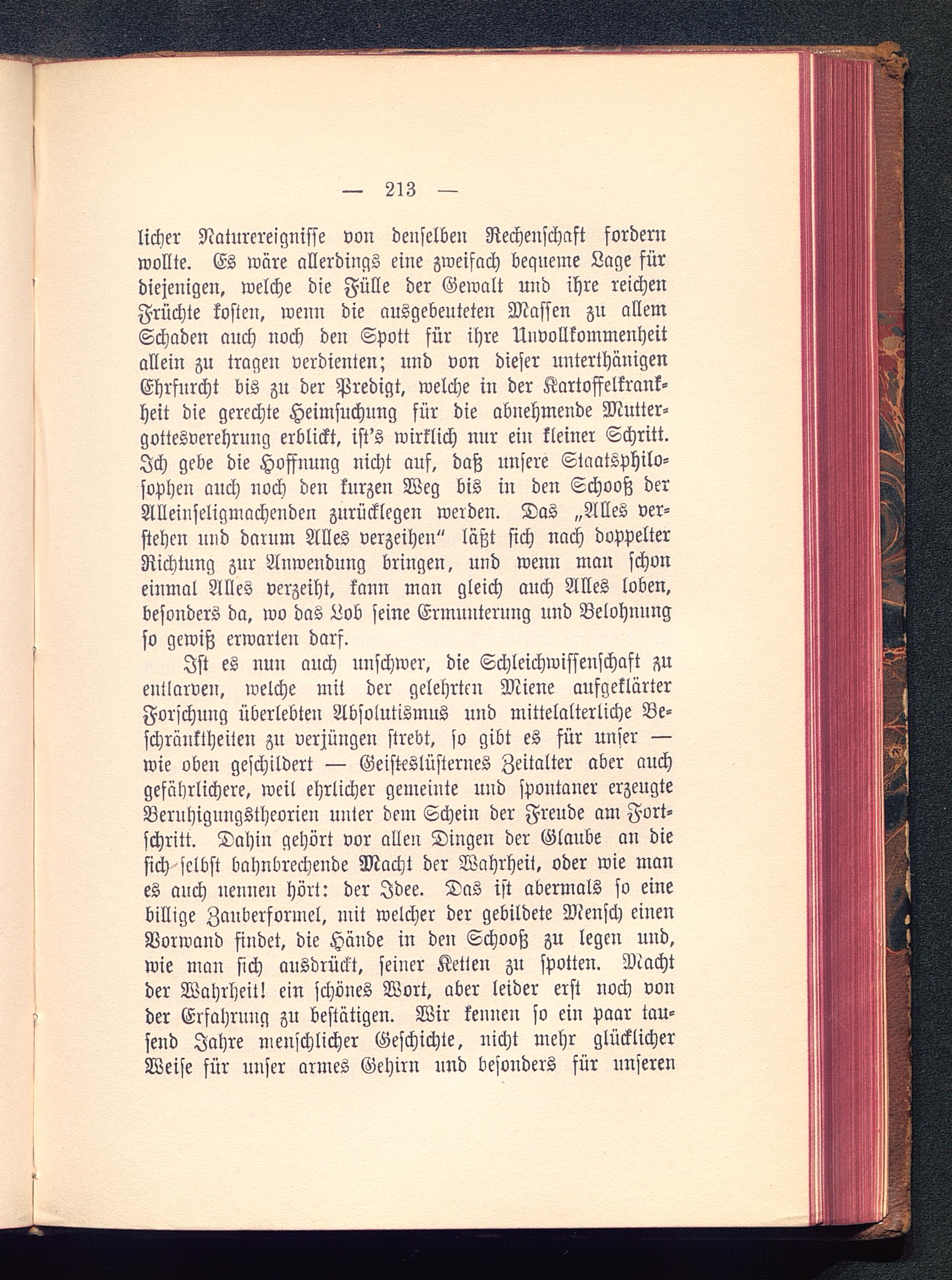 Ist es nuu auch unschwer, die Schleichwissenschaft zuentlarven, welche mit der gelehrten Miene aufgeklärterForschung überlebten Absolutismus und mittelalterliche Be-schränktheiten zu verjüngen strebt, so gibt es für unser —wie oben geschildert — Geiskslüsternes Zeitalter aber auchgefährlichere, weil ehrlicher gemeinte und spontaner erzeugteBernhigungstheorien unter dem Schein der Freude am Fort-schritt. Dahin gehört vor allen Dingen der Glaube an diesich selbst bahnbrechende Macht der Wahrheit, oder wie manes auch nennen hört: der Idee. Das ist abermals so einebillige Zauberformel, mit welcher der gebildete Mensch einenVorwand findet, die Hände in den Schooß zu legen und,wie man sich ausdrückt, seiner Ketten zu spotten. Machtder Wahrheit! ein schönes Wort, aber leider erst noch vonder Erfahrung zu bestätigen. Wir kennen so ein paar tau-send Jahre menschlicher Geschichte, nicht mehr glücklicherWeise für unser armes Gehirn und besonders für unseren