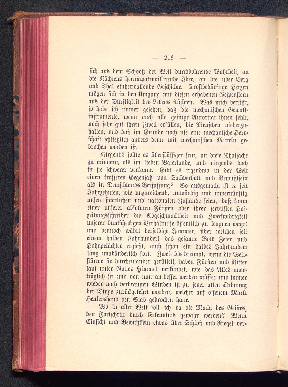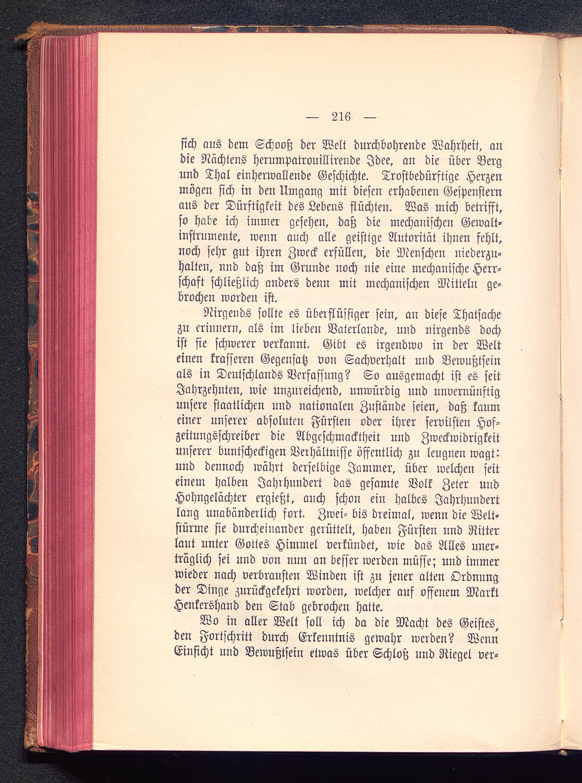 Nirgends sollte es überflüssiger sein, an diese Thatsachezu erinnern, als im lieben Vaterlande, und nirgends dochist sie schwerer verkannt. Gibt es irgendwo in der Welteinen krasseren Gegensatz von Sachverhalt und Bewußtseinals in Deutschlands Verfassung? So ausgemacht ist es seitJahrzehnten, wie unzureichend, unwürdig nnd unvernünftigunsere staatlichen und nationalen Zustände seien, daß kaumeiner unserer absoluten Fürsten oder ihrer servilsten Hof-zeituugsschreiber die Abgeschmacktheit und Zweckwidrigkeitunserer buntscheckigen Verhältnisse öffentlich zu leugnen wagt:und dennoch währt derselbige Jammer, über welchen seiteinem halben Jahrhundert das gesamte Volk Zeter undHohngelächter ergießt, auch schou ein halbes Jahrhundertlang unabänderlich fort. Zwei- bis dreimal, wenn die Welt-stürme sie durcheinander gerüttelt, haben Fürsten und Ritterlaut unter Gottes Himmel verkündet, wie das Alles uner-träglich sei und von nun an besser werden müsse; uud immerwieder nach »erbrausten Winden ist zu jener alten Ordnungder Dinge zurückgekehrt worden, welcher auf offenem MarktHenkershand den Stab gebrochen hatte.