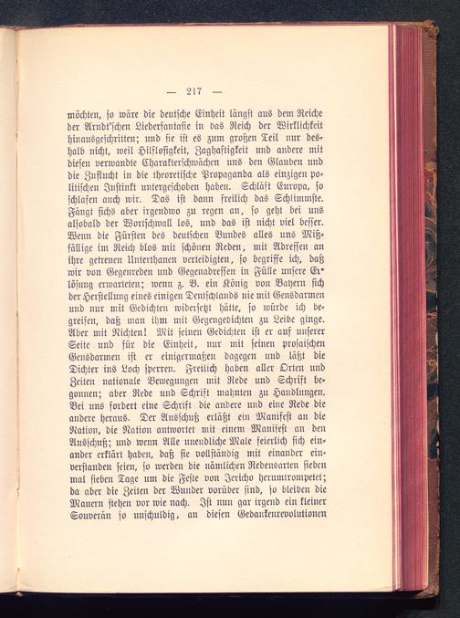 möchten, so wäre die deutsche Einheit längst aus dem Reicheder Arudt'schen Liederfantasie in das Reich der Wirklichkeithinausgeschritten; und sie ist es zum großen Teil nur des-halb nicht, weil Hilflosigkeit. Zaghaftigkeit und andere mitdiesen verwandte Charakterschwächen uns den Glauben unddie Zuflucht in die theoretische Propaganda als einzigen po-litischen Instinkt untergeschoben haben. Schläft Europa , soschlafen auch wir. Das ist dann freilich das Schlimmste.Fängt sichs aber irgendwo zu regen an, so geht bei unsalsobald der Wortschwall los, und das ist nicht viel besser.Wenn die Fürsten des deutschen Bundes alles uns Miß-fällige im Reich blos mit schönen Reden, mit Adressen anihre getreuen Unterthanen verteidigten, so begriffe ich, daßwir von Gegenreden und Gegenadressen in Fülle unsere Ei'lösung erwarteten; wenn z. B. ein König von Bayern sichder Herstellung eines einigen Deutschlands nie mit Gensdarmenund nur mit Gedichten widersetzt hätte, so würde ich be-greifen, daß man ihm mit Gegengewichten zu Leibe ginge.Aber mit Nichten! Mit seinen Gedichten ist er auf unsererSeite und für die Einheit, nur mit seinen prosaischenGensdarmen ist er einigermaßen dagegen und läßt dieDichter ins Loch sperren. Freilich haben aller Orten undZeiten nationale Bewegungen mit Rede und Schrist be-gonnen; aber Rede und Schrift mahnten zu Handlungen.Bei uns fordert eine Schrift die andere und eine Rede dieandere heraus. Der Ausschuß erläßt ein Manifest an dieNation, die Nation antwortet mit einem Manifest an denAusschuß; und wenn Alle unendliche Male feierlich sich ein-ander erklärt haben, daß sie vollständig mit einander ein-verstanden seien, so werden die nämlichen Redensarten siebenmal sieben Tage um die Feste von Jericho herumtrompetet;da aber die Zeiten der Wunder vorüber sind, so bleiben dieMauern stehen vor wie nach. Ist nun gar irgend ein kleinerSouverän so unschuldig, an diesen Gedaukenrevolutionen