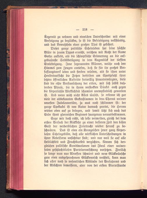 Dieses ganze politische Scheinleben hat seine höchsteBlüte in jenem Typus erreicht, welchem mit Recht der NameGotha anklebt, als die schimpfliche Erinnerung an die auf-geblasenste Selbstbelügung in dem Augenblick der tiefstenErniedrigung. Jene sogenannten Männer, welche noch denHimmel zum Zeugen anriefen, daß sie für ihr großes Ver-sassungswerk leben und sterben würden, als sie schon unterHenkersaufsicht die Fetzen desselben am Spottpfahl ihrerletzten öffentlichen Auftritte freiwillig hinunterwürgten, diesesind die echte Versinnlichung der eitlen, mit sich selbst buh-lenden Phrase, die in ihrem verstockten Dünkel auch gegendie körperlichste Wirklichkeit schamlos unempfindlich gewordenist. Und wenn mich nicht Alles täuscht, so erkenne ich garviele der altbekannten Geckenstimmen in dem Chorus unsererneuesten Jubelouvertüre, ja was noch schlimmer ist: derganze Spektakel ist von Natur darnach geartet, die Herrenwieder oben auf zu bringen, und somit läßt sich auch dasEnde ihres glorreichen Beginnes haargenau vorausbestimmen.