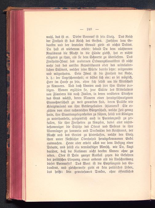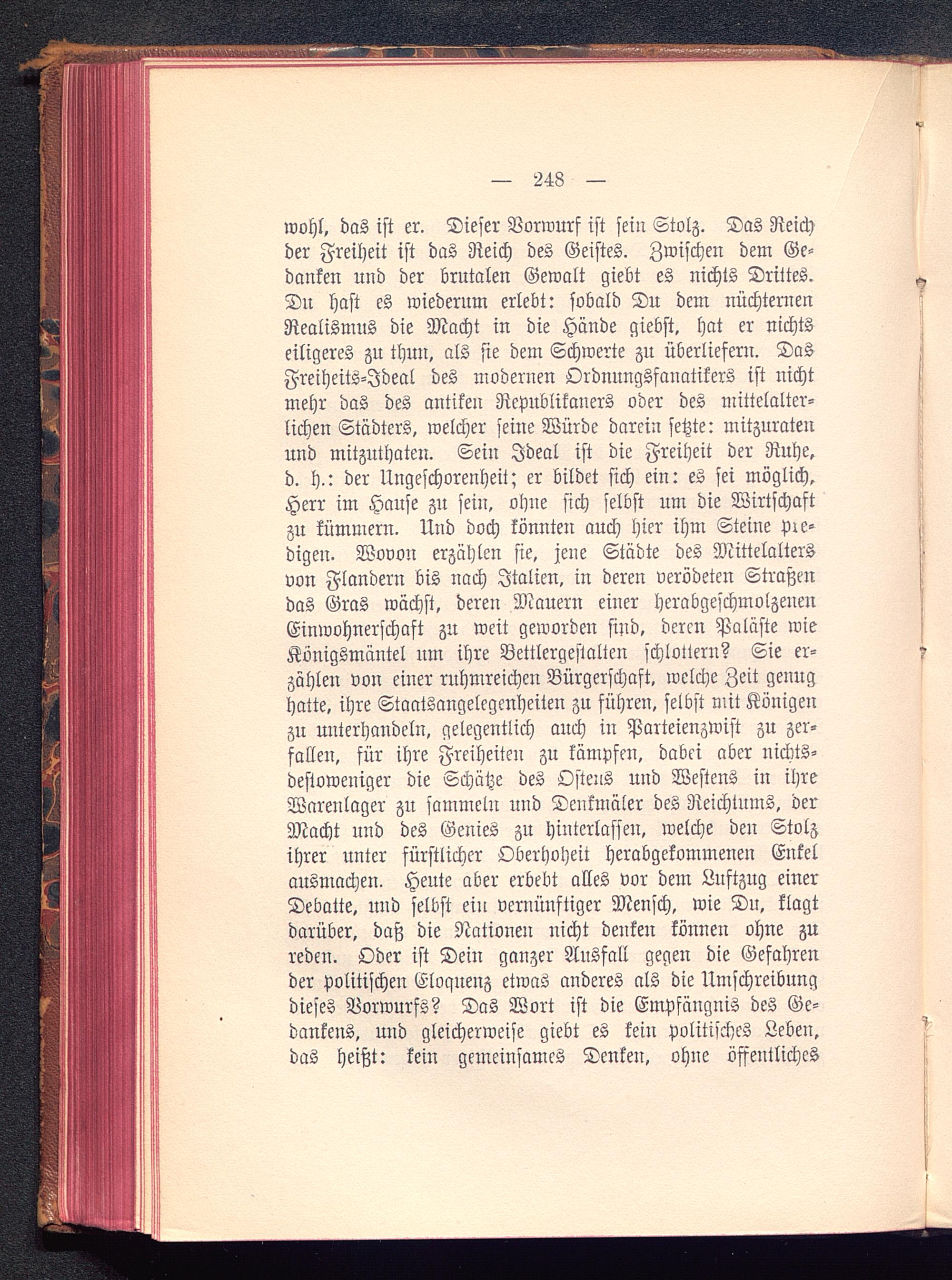 wohl, das ist er. Dieser Vorwurf ist sein Stolz. Das Reichder Freiheit ist das Reich des Geistes. Zwischen dem Ge-danken und der brutalen Gewalt giebt es nichts Drittes.Du hast es wiederum erlebt: sobald Du dem nüchternenRealismus die Macht in die Hände giebst, hat er nichtseiligeres zu thun, als sie dem Schwerte zu überliefern. DasFreiheits-Jdeal des moderneu Ordnungsfanatikers ist nichtmehr das des antiken Republikaners oder des mittelalter-lichen Städters, welcher seine Würde darein setzte: mitzuratenund mitzuthaten. Sein Ideal ist die Freiheit der Ruhe,d. h.: der Ungeschorenheit; er bildet sich ein: es sei möglich,Herr im Hause zu sein, ohne sich selbst um die Wirtschaftzu kümmern. Und doch könnten auch hier ihm Steine pre-digen. Wovon erzählen sie, jene Städte des Mittelaltersvon Flandern bis nach Italien , in deren verödeten Straßendas Gras wächst, deren Mauern einer herabgeschmolzenenEinwohnerschaft zu weit geworden sind, deren Paläste wieKönigsmäntel um ihre Bettlergestalten schlottern? Sie er-zähle« von einer ruhmreichen Bürgerschaft, welche Zeit genughatte, ihre Staatsangelegenheiten zu führen, selbst mit Königenzu unterhandeln, gelegentlich auch in Parteienzwist zu zer-fallen, für ihre Freiheiten zu kämpfen, dabei aber nichts-destoweniger die Schätze des Ostens und Westens in ihreWarenlager zu sammeln und Denkmäler des Reichtums, derMacht und des Genies zu hinterlassen, welche den Stolzihrer unter fürstlicher Oberhoheit herabgekommenen Enkelausmachen. Heute aber erbebt alles vor dem Luftzug einerDebatte, und selbst ein vernünftiger Mensch, wie Du, klagtdarüber, daß die Nationen nicht denken können ohne zureden. Oder ist Dein ganzer Ausfall gegen die Gefahrender politischen Eloqnenz etwas anderes als die Umschreibungdieses Vorwurfs? Das Wort ist die Empfängnis des Ge-dankens, und gleicherweise giebt es kein politisches Leben,das heißt: kein gemeinsames Denken, ohne öffentliches