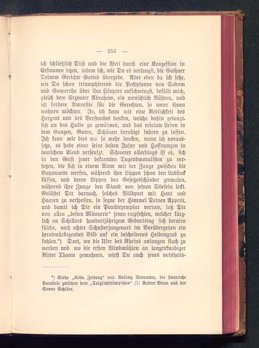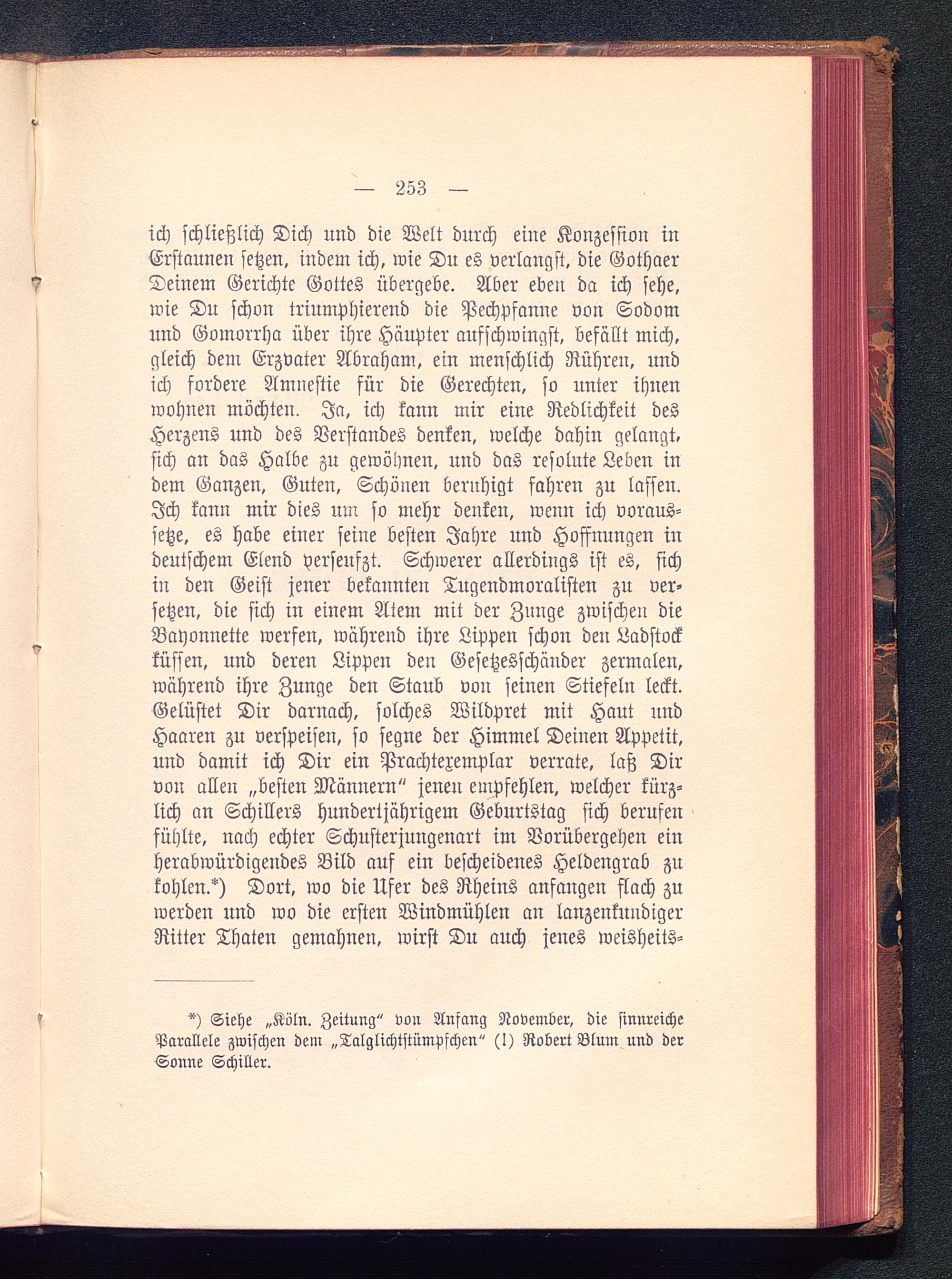 ich schließlich Dich und die Welt durch eiue Konzession inErstaunen setzen, indem ich, wie Du es verlangst, die GothaerDeinem Gerichte Gottes übergebe. Aber eben da ich sehe,wie Du schon triumphierend die Pechpfanne von Sodomund Gomorrha über ihre Häupter aufschwingst, befällt mich,gleich dem Erzvater Abraham, ein menschlich Rühren, undich fordere Amnestie für die Gerechten, so unter ihnenwohnen möchten. Ja, ich kann mir eine Redlichkeit desHerzens und des Verstandes denken, welche dahin gelangt,sich an das Halbe zu gewöhnen, und das resolute Leben indem Ganzen, Guten, Schönen beruhigt fahren zu lassen.Ich kann mir dies um so mehr denken, wenn ich voraus-setze, es habe einer seine besten Jahre und Hoffnungen indeutschem Elend yerseufzt. Schwerer allerdings ist es, sichin den Geist jener bekannten Tugendmoralisten zu ver-setzen, die sich in einem Atem mit der Zunge zwischen dieBayonnette werfen, während ihre Lippen schon den Ladstockküssen, und deren Lippen den Gesetzesschänder zermalm,während ihre Zunge den Staub von seinen Stiefeln leckt.Gelüstet Dir darnach, solches Wildpret mit Haut undHaaren zu verspeisen, so segne der Himmel Deinen Appetit,und damit ich Dir ein Prachtexemplar verrate, laß Dirvon allen „besten Männern" jenen empfehlen, welcher kürz-lich an Schillers hundertjährigem Geburtstag sich berufenfühlte, nach echter Schusterjuugenart im Vorübergehen einherabwürdigendes Bild auf ein bescheidenes Heldengrab zukohlen.*) Dort, wo die Ufer des Rheins anfangen flach zuwerden und wo die ersten Windmühlen an lanzenkundigerRitter Thaten gemahnen, wirst Du auch jenes weisheits-