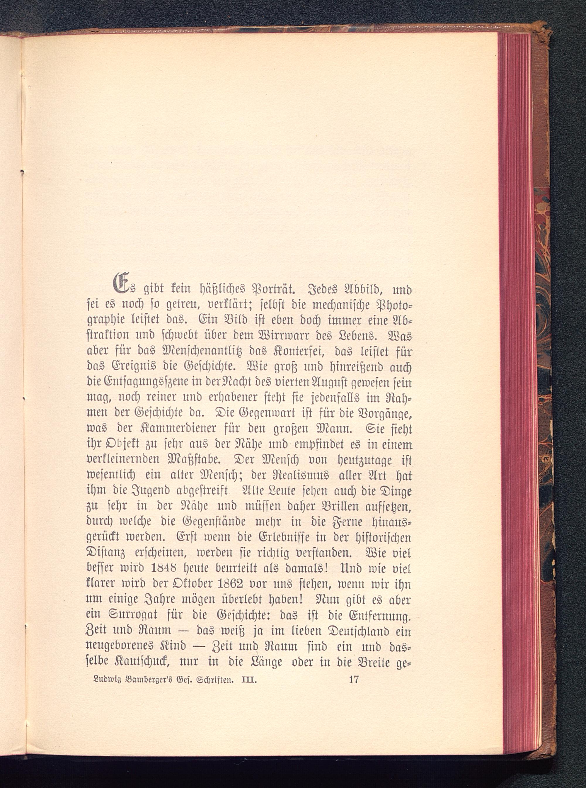 Es gibt kein häßliches Porträt. Jedes Abbild, undsei es noch so getreu, verklärt; selbst die mechanische Photo-graphie leistet das. Ein Bild ist eben doch immer eine Ab-straktion und schwebt über dem Wirrwarr des Lebens. Wasaber für das Menschenantlitz das Konterfei, das leistet fürdas Ereignis die Geschichte. Wie groß und hinreißend auchdie Entsagungsszene in derNacht des vierten August gewesen seinmag. noch reiner und erhabener steht sie jedenfalls im Rah-men der Geschichte da. Die Gegenwart ist für die Vorgänge,was der Kammerdiener für den großen Mann. Sie siehtihr Objekt zu sehr aus der Nähe und empfindet es in einemverkleinernden Maßstabe. Der Mensch von heutzutage istwesentlich ein alter Mensch; der Realismus aller Art hatihm die Jugend abgestreift Alte Leute sehen auch die Dingezu sehr in der Nähe und müssen daher Brillen aufsetzen,durch welche die Gegenstände mehr in die Ferne hinaus-gerückt werden. Erst wenn die Erlebnisse in der historischenDistanz erscheinen, werden sie richtig verstanden. Wie vielbesser wird heute beurteilt als damals! Und wie vielklarer wird der Oktober 1862 vor uns stehen, wenn wir ihnum einige Jahre mögen überlebt haben! Nun gibt es aberein Surrogat für die Geschichte: das ist die Entfernung.Zeit und Raum — das weiß ja im lieben Deutschland einneugeborenes Kind — Zeit und Raum sind ein und das-selbe Kautschuck, nur in die Lange oder in die Breite ge-Ludwig Bamberger'S Ges. Schriften. IH. 17