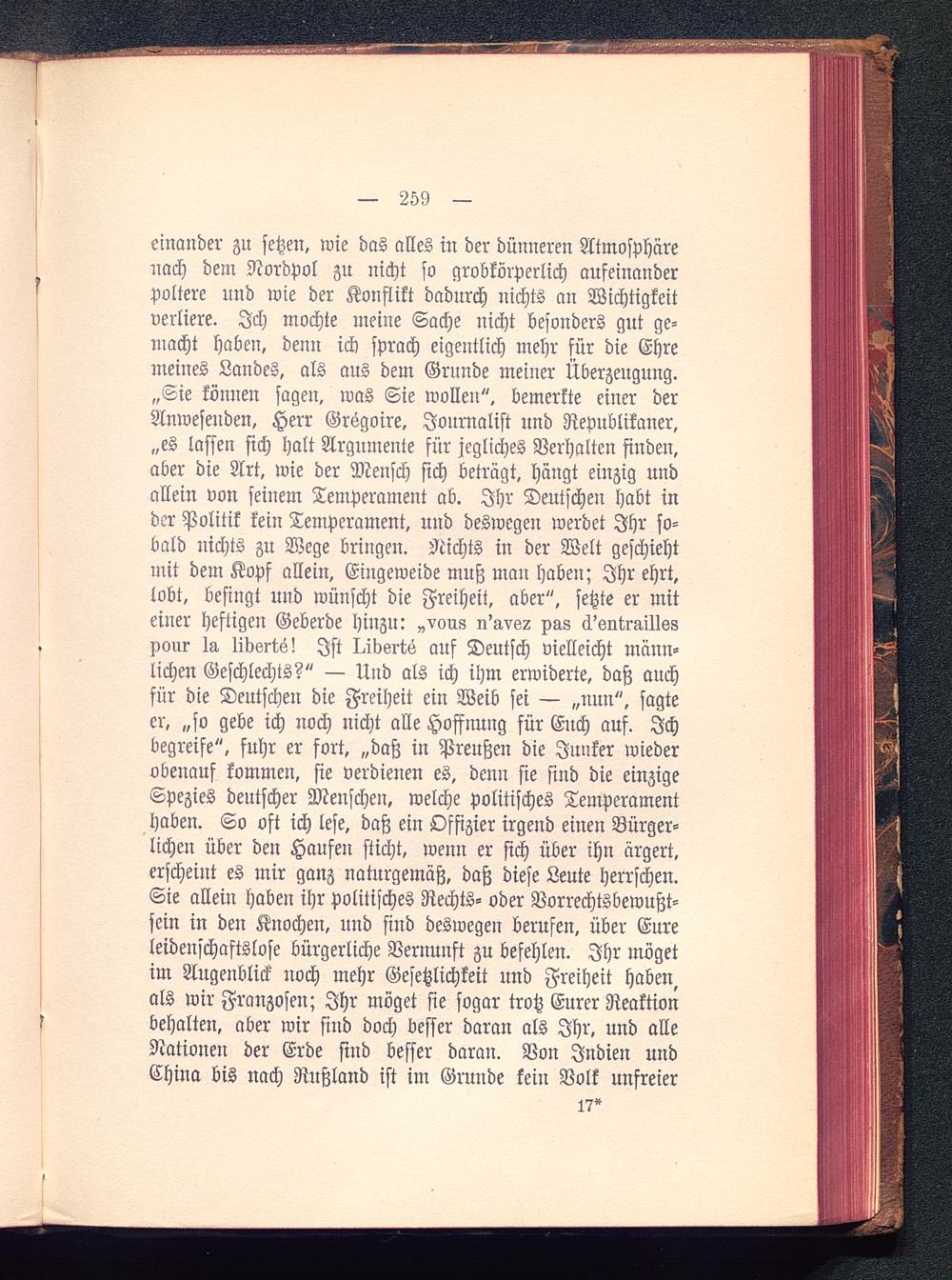 einander zu setzen, wie das alles in der dünneren Atmosphärenach dem Nordpol zu nicht so grobkörperlich aufeinanderpoltere und wie der Konflikt dadurch nichts au Wichtigkeitverliere. Ich mochte meine Sache nicht besonders gut ge-macht haben, denu ich sprach eigentlich mehr für die Ehremeines Landes, als aus dem Grunde meiner Überzeugung.„Sie können sagen, was Sie wollen", bemerkte einer derAnwesenden, Herr Grsgoire, Journalist und Republikaner ,„es lassen sich halt Argumente für jegliches Verhalten finden,aber die Art, wie der Mensch sich beträgt, hängt einzig undallein von seinem Temperament ab. Ihr Deutscheu habt inder Politik kein Temperament, und deswegen werdet Ihr so-bald nichts zu Wege bringen. Nichts in der Welt geschiehtmit dem Kopf allein, Eingeweide muß mau haben; Ihr ehrt,lobt, besingt und wünscht die Freiheit, aber", setzte er miteiner heftigen Geberde hinzu: „vous o'g,vs2 xas ä'sQtraillsspour 1a libsrts! Ist I/bsrte auf Deutsch vielleicht männ-lichen Geschlechts?" — Und als ich ihm erwiderte, daß auchfür die Deutschen die Freiheit ein Weib sei — „nuu", sagteer, „so gebe ich noch nicht alle Hoffnung für Euch auf. Ichbegreife", fuhr er fort, „daß in Preußen die Junker wiederobeuauf kommen, sie verdienen es, denn sie sind die einzigeSpezies deutscher Menschen, welche politisches Temperamenthaben. So oft ich lese, daß ein Osfizier irgend einen Bürger-lichen über den Haufeu sticht, wenn er sich über ihn ärgert,erscheint es mir ganz naturgemäß, daß diese Leute herrschen.Sie allein haben ihr politisches Rechts- oder Vorrechtsbewußt-sein in den Knochen, uud sind deswegen berufen, über Eureleidenschaftslose bürgerliche Vernuuft zu befehlen. Ihr mögetim Augenblick noch mehr Gesetzlichkeit und Freiheit habenals wir Franzosen ; Ihr möget sie sogar trotz Eurer Reaktionbehalten, aber wir sind doch besser daran als Ihr, und alleNationen der Erde sind besser daran. Von Indien undChina bis nach Rußland ist im Gruude kein Volk unfreier
