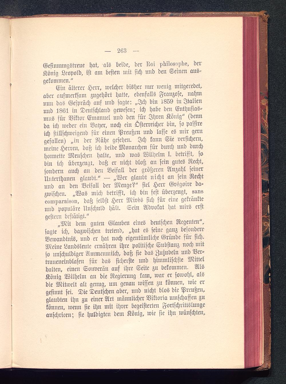 Ein älterer Herr, welcher bisher nur wenig mitgeredet,aber aufmerksam zugehört hatte, ebenfalls Franzose, nahmnun das Gespräch auf und sagte: „Ich bin 1859 in Italien und 1861 in Deutschland gewesen; ich habe den Enthusias-mus für Viktor Emanuel und den für Ihren König" (dennda ich weder ein Bayer, noch ein Österreicher bin, so pasfireich stillschweigend für einen Preußen und lasse es mir gerngefallen) „in der Nähe gesehen. Ich kann Sie versichern,meine Herren, daß ich beide Monarchen für durch und durchhonnette Menschen halte, und was Wilhelm I. betrifft, sobin ich überzeugt, daß er nicht bloß an sein gutes Recht,sondern auch an den Beifall der größeren Anzahl seinerUnterthanen glaubt." — „Wer glaubt nicht an sein Rechtund an den Beifall der Menge?" fiel Herr Gr«goire da-zwischen. „Was mich betrifft, ich bin fest überzeugt, savseompar^son, daß selbst Herr Mirss sich für eine gekränkteund populäre Unschuld hält. Sein Advokat hat mirs erstgestern bestätigt."