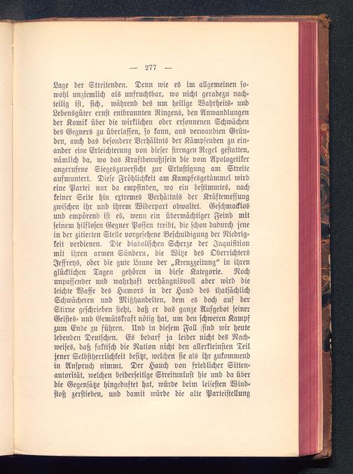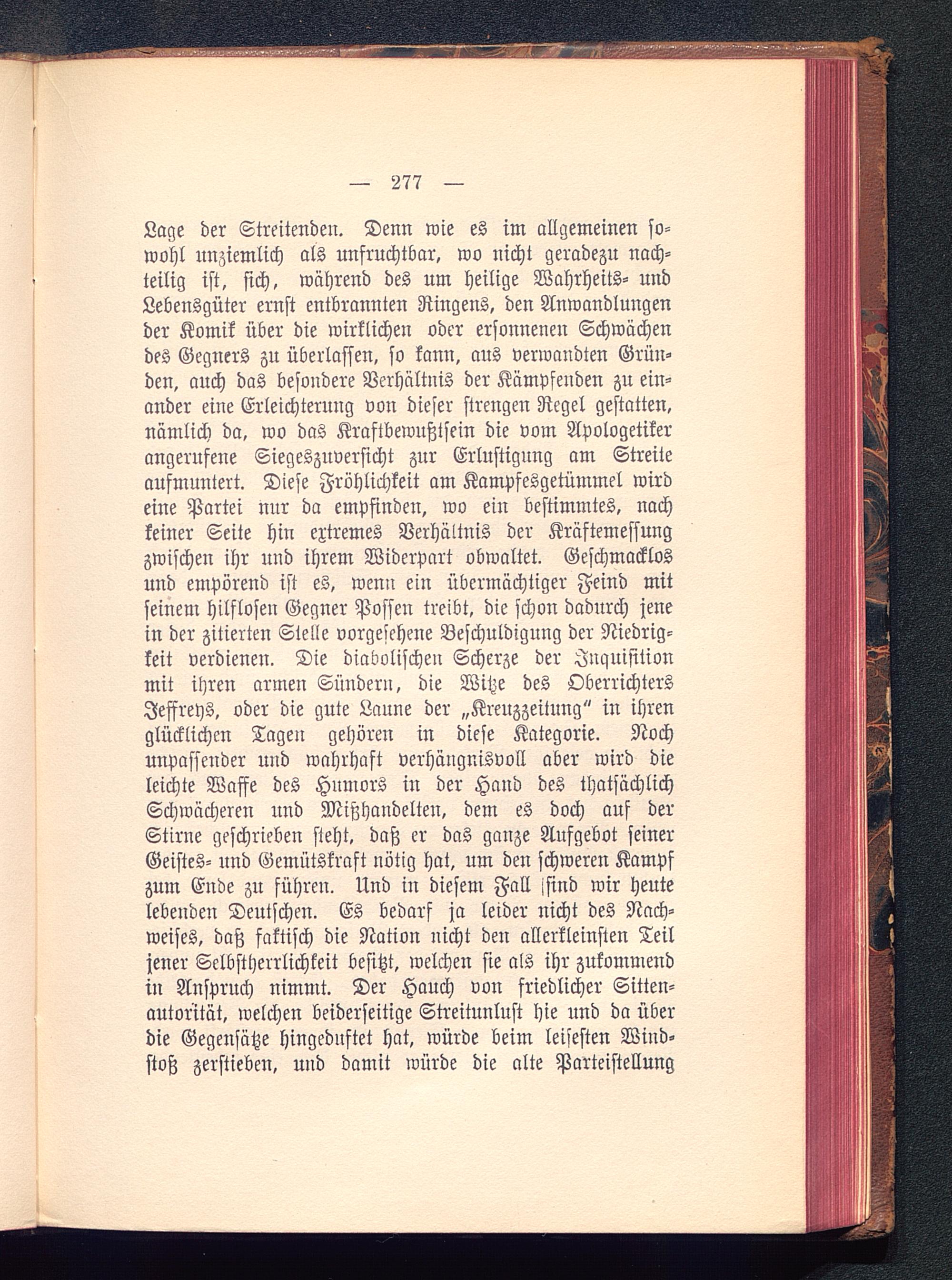 Lage der Streitenden. Denn wie es im allgemeinen so-wohl unziemlich als unfruchtbar, wo nicht geradezu nach-teilig ist, sich, während des um heilige Wahrheits- undLebensgüter ernst entbrannten Ringens, den Anwandlungender Komik über die wirklichen oder ersonnenen Schwächendes Gegners zu überlassen, so kann, aus verwandten Grün-den, auch das besondere Verhältnis der Kämpfenden zu ein-ander eine Erleichterung von dieser strengen Regel gestatten,nämlich da, wo das Kraftbewußtsein die vom Apologetikerangerufene Siegeszuversicht zur Erlustigung am Streiteaufmuntert. Diese Fröhlichkeit am Kampfesgetümmel wirdeine Partei nur da empfinden, wo ein bestimmtes, nachkeiner Seite hin extremes Verhältnis der Kräftemessungzwischen ihr und ihrem Widerpart obwaltet. Geschmacklosund empörend ist es, wenn ein übermächtiger Feind mitseinem hilflosen Gegner Possen treibt, die schon dadurch jenein der zitierten Stelle vorgesehene Beschuldigung der Niedrig-keit verdienen. Die diabolischen Scherze der Inquisitionmit ihren armen Sündern, die Witze des OberrichtersJeffreys, oder die gute Laune der „Kreuzzeitung " in ihrenglücklichen Tagen gehören in diese Kategorie. Nochunpassender nnd wahrhaft verhängnisvoll aber wird dieleichte Waffe des Humors in der Hand des thatsächlichSchwächeren und Mißhandelten, dem es doch auf derStirne geschrieben steht, daß er das ganze Aufgebot seinerGeistes- und Gemütskraft nötig hat, um den schweren Kampfzum Ende zu führen. Und in diesem Fall isind wir heutelebenden Deutschen. Es bedarf ja leider nicht des Nach-weises, daß faktisch die Nation nicht den allerkleinsten Teiljener Selbstherrlichkeit besitzt, welchen sie als ihr zukommendin Anspruch nimmt. Der Hauch von friedlicher Sitten-autorität, welchen beiderseitige Streitunlust hie und da überdie Gegensätze hingednftet hat, würde beim leisesten Wind-stoß zerstieben, und damit würde die alte Parteistellung