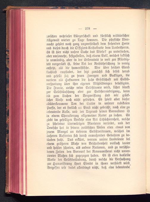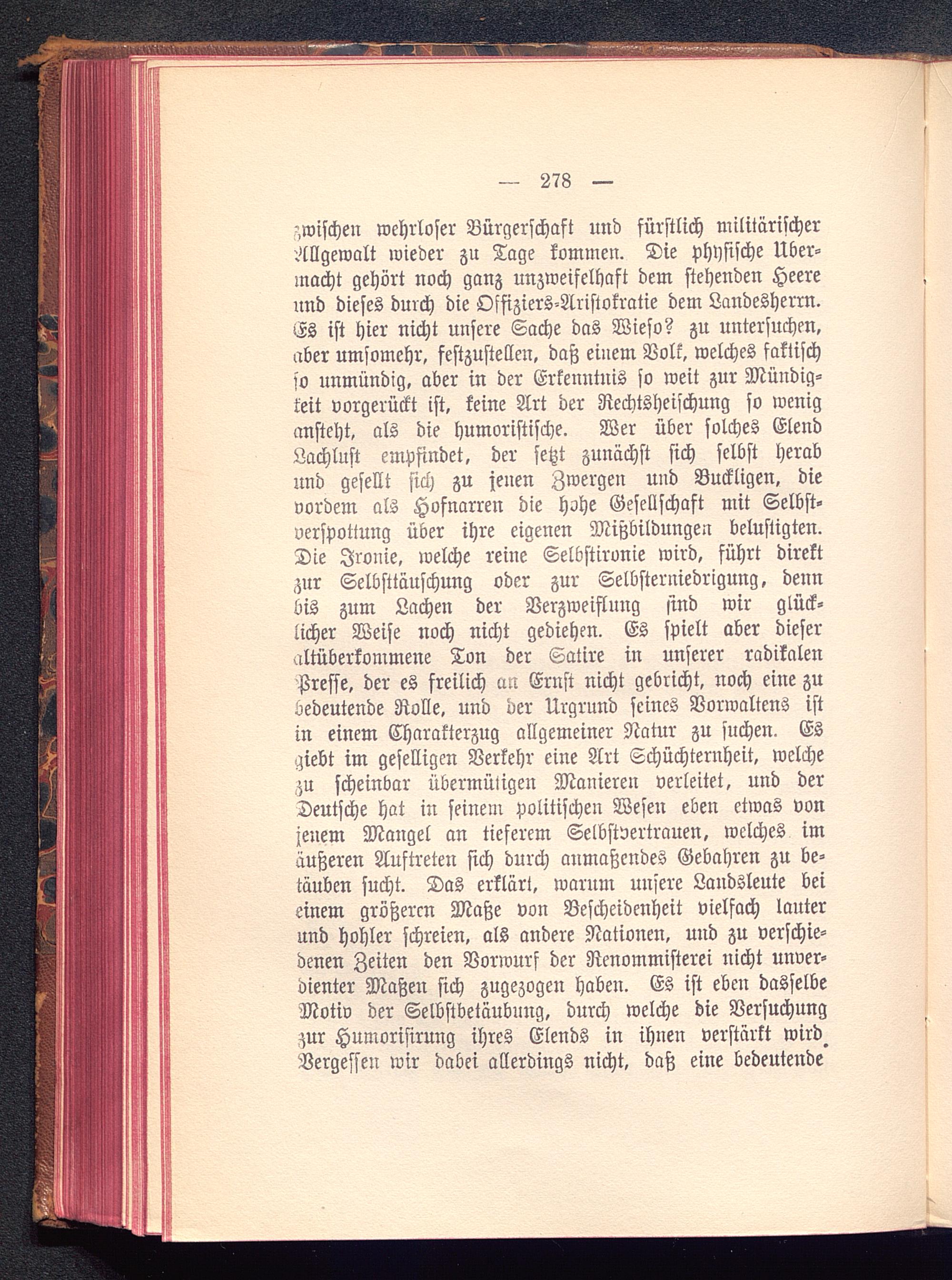 zwischen wehrloser Bürgerschaft und fürstlich militärischerAllgewalt wieder zu Tage kommen. Die Physische Über-macht gehört noch ganz unzweifelhaft dem stehenden Heereund dieses durch die Offiziers-Aristokratie dem Landesherrn.Es ist hier nicht unsere Sache das Wieso? zu untersuchen,aber umsomehr, festzustellen, daß einem Volk, welches faktischso unmündig, aber in der Erkenntnis so weit zur Mündig-keit vorgerückt ist, keine Art der Rechtsheischung so wenigansteht, als die humoristische. Wer über solches ElendLachlust empfindet, der setzt zunächst sich selbst herabund gesellt sich zu jenen Zwergen und Buckligen, dievordem als Hofnarren die hohe Gesellschaft mit Selbst-verspotiung über ihre eigenen Mißbildungen belustigten.Die Ironie, welche reine Selbstirvnie wird, führt direktzur Selbsttäuschung oder zur Selbsterniedrigung, dennbis zum Lachen der Verzweiflung sind wir glück-licher Weise noch nicht gediehen. Es spielt aber dieseraltüberkoinmene Ton der Satire in unserer radikalenPresse, der es freilich an Ernst nicht gebricht, noch eine zubedeutende Rolle, und der Urgrund seines Vorwaltens istin einem Charakterzug allgemeiner Natur zu suchen. Esgiebt im geselligen Verkehr eine Art Schüchternheit, welchezu scheinbar übermütigen Maniereu verleitet, und derDeutsche hat in seinem politischen Wesen eben etwas vonjenem Mangel an tieferem Selbstvertrauen, welches imäußeren Auftreten sich durch anmaßendes Gebühren zu be-täuben sucht. Das erklärt, warum unsere Landsleute beieinem größeren Maße von Bescheidenheit vielfach lauterund hohler schreien, als andere Nationen, und zu verschie-denen Zeiten den Vorwurf der Renommisterei nicht unver-dienter Maßen sich zugezogen haben. Es ist eben dasselbeMotiv der Selbstbetäubnug, durch welche die Versuchungzur Humorisirung ihres Elends in ihnen verstärkt wird.Bergessen wir dabei allerdings nicht, daß eine bedeutende