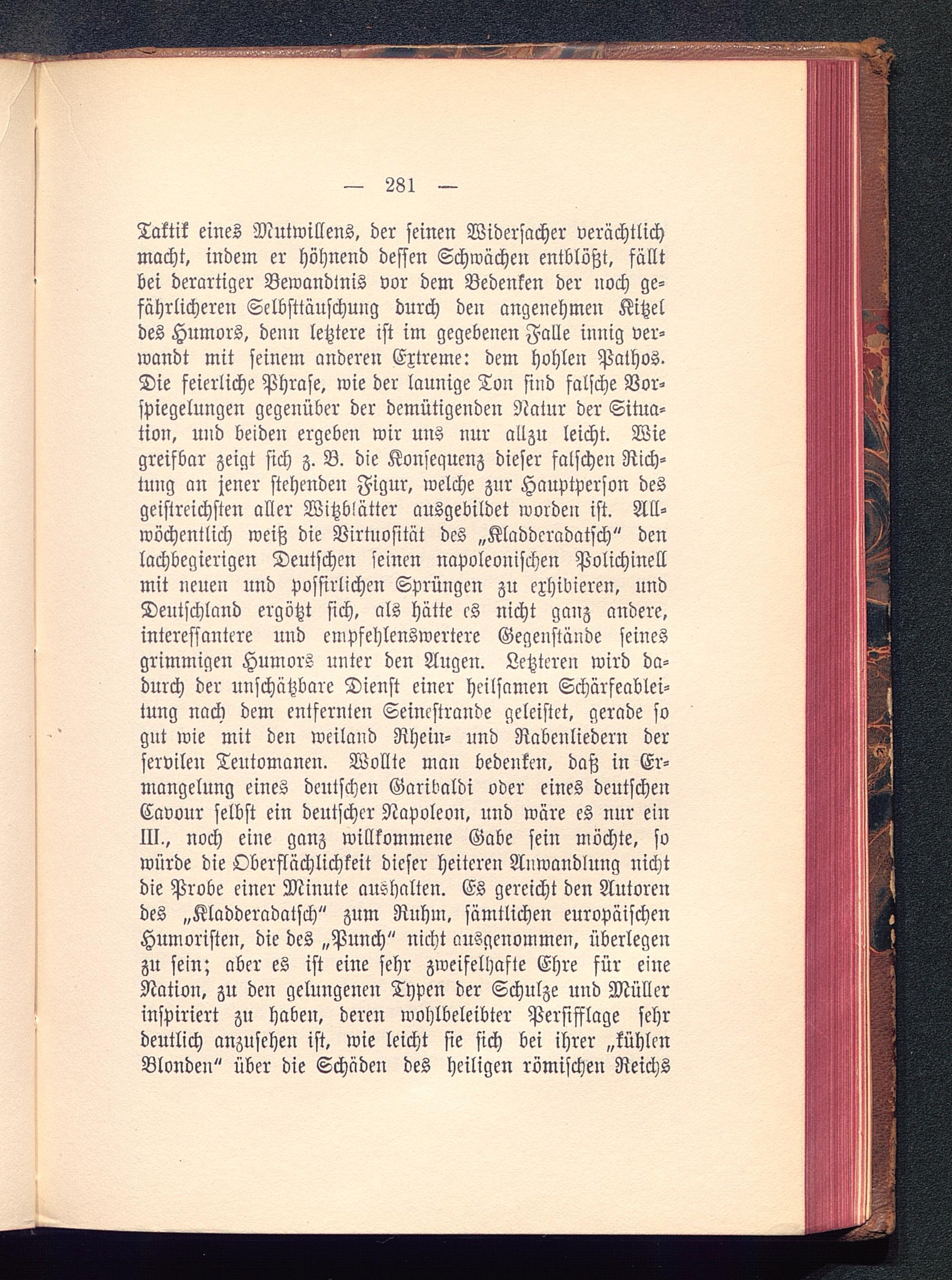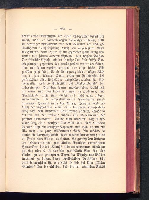 Taktik eines Mutwillens, der seinen Widersacher verächtlichmacht, indem er höhnend dessen Schwächen entblößt, fälltbei derartiger Bewandtnis vor dem Bedenken der noch ge-fährlicheren Selbsttäuschung durch den angenehmen Kitzeldes Humors, denn letztere ist im gegebenen Falle innig ver-wandt mit seinem anderen Extreme: dem hohlen Pathos.Die feierliche Phrase, wie der launige Ton sind falsche Vor-spiegelungen gegenüber der demütigenden Natur der Situa-tion, und beiden ergeben wir uns nur allzu leicht. Wiegreifbar zeigt sich z. B. die Konsequenz dieser falschen Rich-tung an jener stehenden Figur, welche zur Hauptperson desgeistreichsten aller Witzblätter ausgebildet worden ist. All-wöchentlich weiß die Virtuosität des „Kladderadatsch" denlachbegierigen Deutschen seinen napoleonischen Polichinellmit neuen und posfirlicheu Sprüngen zu exhibieren, nndDeutschland ergötzt sich, als hätte es nicht ganz andere,interessantere und empfehlenswertere Gegenstände seinesgrimmigen Humors unter den Augen. Letzteren wird da-durch der unschätzbare Dienst einer heilsamen Schärfeablei-tung nach dem entfernten Seinestrande geleistet, gerade sogut wie mit den weiland Rhein - und Rabenliedern derservilen Teutomanen. Wollte mau bedenken, daß in Er-mangelung eines deutschen Garibaldi oder eines deutschen Cavour selbst ein deutscher Napoleon, uud wäre es nur einIII., noch eine ganz willkommene Gabe sein möchte, sowürde die Oberflächlichkeit dieser heiteren Anwandlung nichtdie Probe einer Minute aushalten. Es gereicht den Autorendes „Kladderadatsch" zum Ruhm, sämtlichen europäischenHumoristen, die des „Punch" nicht ausgenommen, überlegenzu sein; aber es ist eine sehr zweifelhafte Ehre für eineNation, zu den gelungenen Typen der Schulze uud Müllerinspiriert zu haben, deren wohlbeleibter Persifflage sehrdeutlich anzusehen ist, wie leicht sie sich bei ihrer „kühlenBlonden" über die Schäden des heiligen römischen Reichs