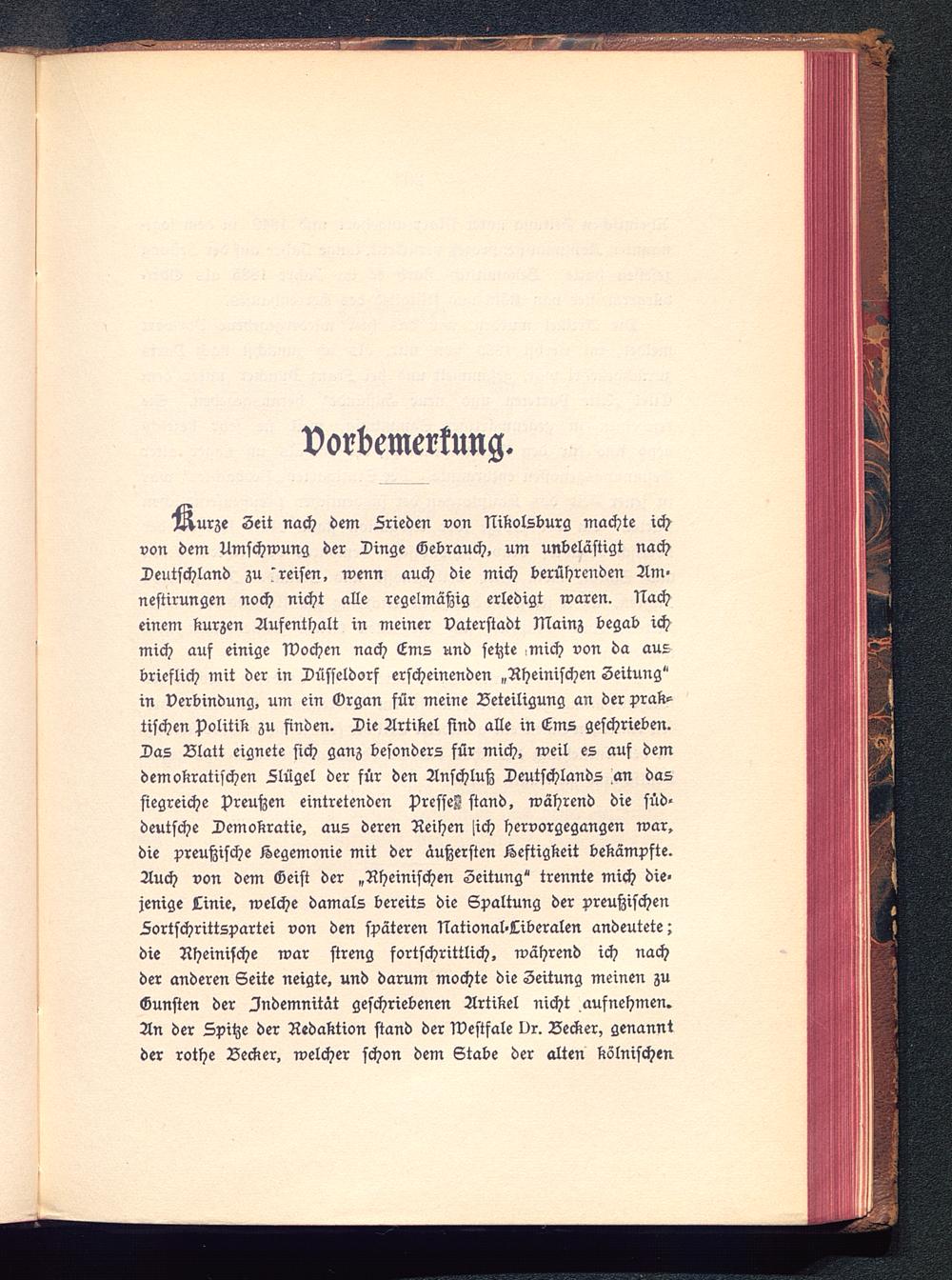 urze Seit nach dem Lrieden von Nikolsburg machte ichvon dem Umschwung der Dinge Gebrauch, um unbelästigt nachDeutschland zu 'reisen, wenn auch die mich berührenden Am-nestirungen noch nicht alle regelmäßig erledigt waren. Nacheinem kurzen Aufenthalt in meiner Vaterstadt Mainz begab ichmich auf einige Wochen nach Cms und setzte mich von da ausbrieflich mit der in Düsseldorf erscheinenden „Rheinischen Zeitung "in Verbindung, um ein Grgan für meine Beteiligung an der prak-tischen Politik zu finden. Die Artikel sind alle in Cms geschrieben.Das Blatt eignete sich ganz besonders für mich, weil es auf demdemokratischen Llügel der für den Anschluß Deutschlands an dassiegreiche Preußen eintretenden presseZ stand, während die süd-deutsche Demokratie, aus deren Reihen >ich hervorgegangen war,die preußische Hegemonie mit der äußersten Heftigkeit bekämpfte.Auch von dem Geist der „Rheinischen Zeitung " trennte mich die-jenige Linie, welche damals bereits die Spaltung der preußischenFortschrittspartei von den späteren National-Liberalen andeutete;die Rheinische war streng fortschrittlich, während ich nachder anderen Seite neigte, und darum mochte die Zeitung meinen zuGunsten der Indemnität geschriebenen Artikel nicht aufnehmen.An der Spitze der Redaktion stand der westfale Dr. Becker, genanntder rothe Lecker, welcher schon dem Stäbe der alten kölnischen