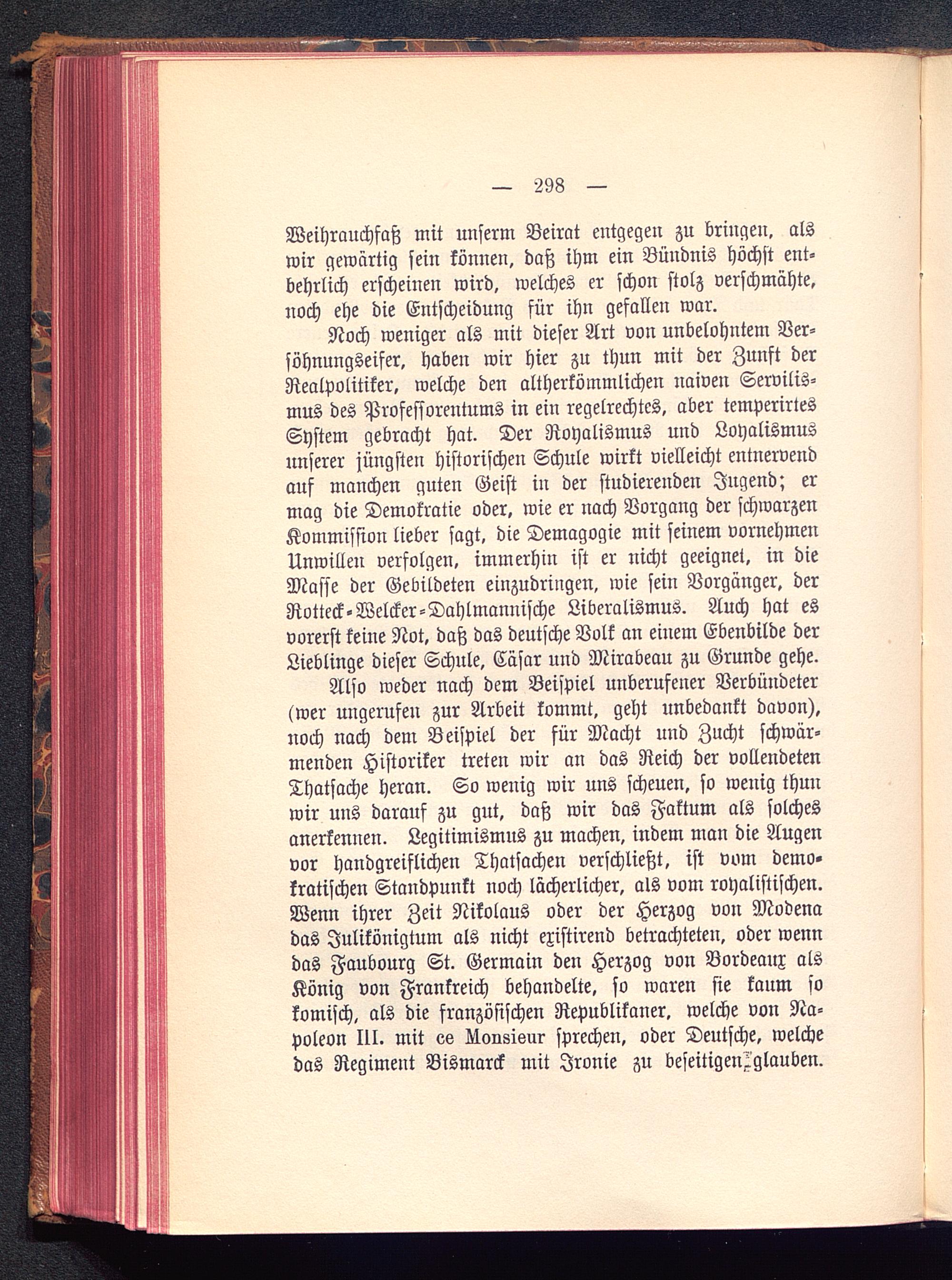 Noch weniger als mit dieser Art von unbelohntem Ver-söhnungseifer, haben wir hier zu thun mit der Zunft derRealpolitiker, welche den altherkömmlichen naiven Servilis-mus des Professorentums in ein regelrechtes, aber temperirtesSystem gebracht hat. Der Royalismus und Loyalismusimserer jüngsten historischen Schule wirkt vielleicht entnervendauf manchen guten Geist in der studierenden Jngend; ermag die Demokratie oder, wie er nach Vorgang der schwarzenKommission lieber sagt, die Demagogie mit seinem vornehmenUnwillen verfolgen, immerhin ist er nicht geeignet, in dieMasse der Gebildeten einzudringen, wie sein Vorgänger, derRotteck-Welcker-Dahlmannische Liberalismus. Auch hat esvorerst keine Not, daß das deutsche Volk an einem Ebenbilde derLieblinge dieser Schnle, Cäsar und Mirabeau zu Grunde gehe.