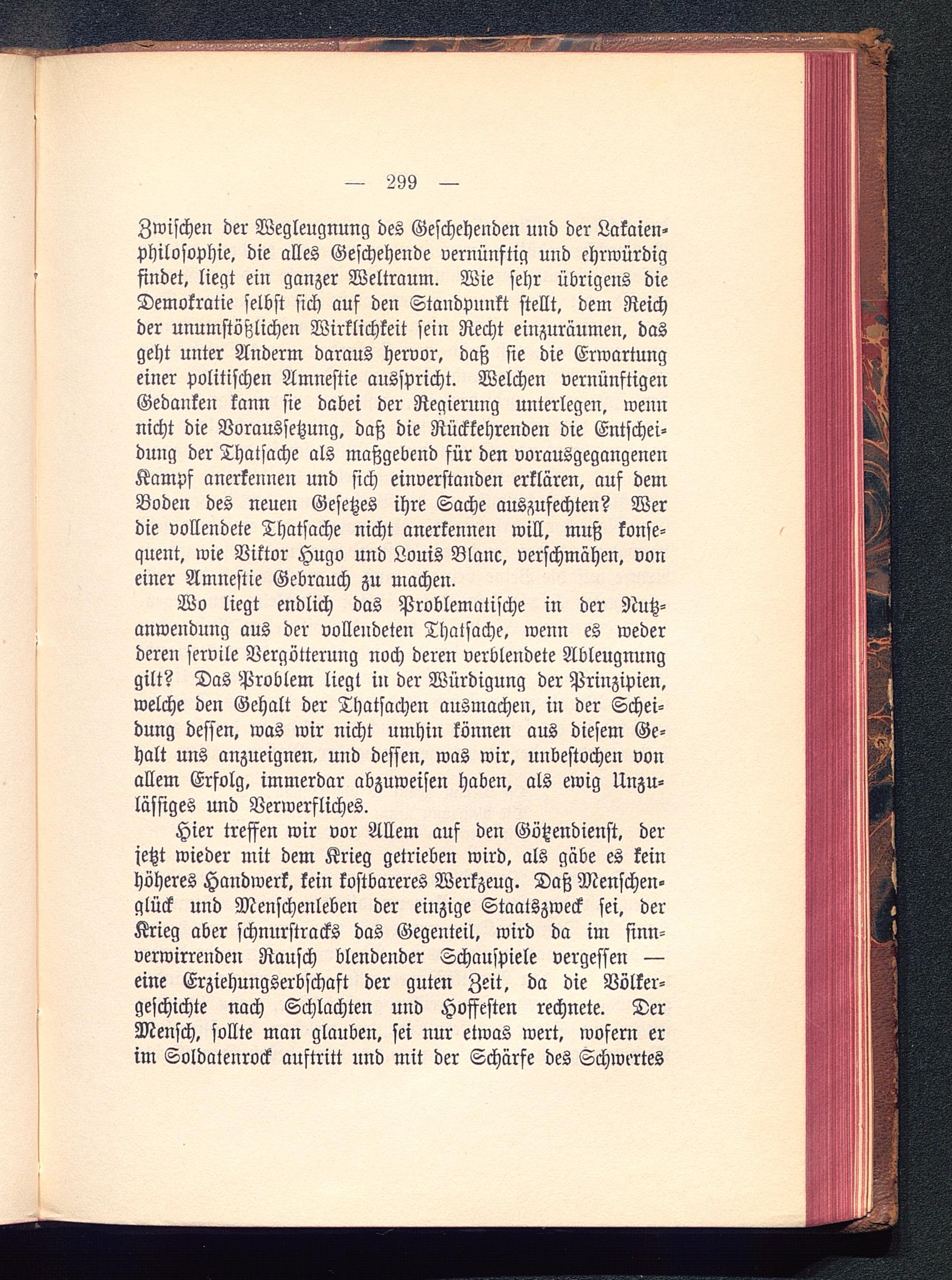 Wo liegt endlich das Problematische in der Nutz-anwendung aus der vollendeten Thatsache, wenn es wederderen servile Vergötterung noch deren verblendete Ableugnunggilt? Das Problem liegt in der Würdigung der Prinzipien,welche den Gehalt der Thatsachen ausmachen, in der Schei-dung dessen, was wir nicht umhin können aus diesem Ge-halt uns anzueignen, und dessen, was wir, unbestochen vonallem Erfolg, immerdar abzuweisen haben, als ewig Unzu-lässiges und Verwerfliches.