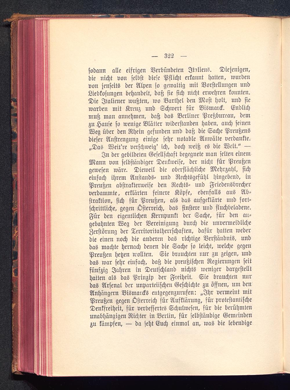 sodann alle eifrigen Verbündeten Italiens . Diejenigen,die nicht von selbst diese Pflicht erkannt hatten, wurdenvon jenseits der Alpen so gewaltig mit Vorstellungen undLiebkosungen behandelt, daß sie sich nicht erwehren konnten.Die Italiener wußten, wo Barthel den Most holt, und siewarben mit Kreuz und Schwert für Bismarck . Endlichmuß man annehmen, daß das Berliner Preßbureau, demzu Hause so wenige Blätter widerstanden haben, auch seinenWeg über den Rhein gesunden und daß die Sache Preußensdieser Anstrengung einige sehr notable Anwälte verdankte.„Das Weit're verschweig' ich, doch weiß es die Welt." —In der gebildeten Gesellschaft begegnete man selten einemMann von selbständiger Denkweise, der nicht für Preußen gewesen wäre. Dieweil die oberflächliche Mehrzahl, sicheinfach ihrem Anstands- und Rechtsgefühl hingebend, inPreußen abstrakterweise den Rechts- und Friedensbrecherverdammte, erklärten feinere Köpfe, ebenfalls aus Ab-straktion, sich für Preußen , als das aufgeklärte und fort-schrittliche, gegen Österreich , das finstere und fluchbeladene.Für den eigentlichen Kernpunkt der Sache, für den an-gebahnten Weg der Vereinigung durch die unvermeidlicheZerstörung der Territoritalherrschaften, dafür hatten wederdie einen noch die anderen das richtige Verständnis, unddas machte hernach denen die Sache so leicht, welche gegenPreußen Hetzen wollten. Sie brauchten nur zu zeigen, unddas war sehr einfach, daß die preußischen Regierungen seitfünfzig Jahren in Deutschland nichts weniger dargestellthatten als das Prinzip der Freiheit. Sie brauchten nurdas Arsenal der unparteiischen Geschichte zu öffnen, um denAnhängern Bismarcks entgegenzurufen: „Ihr vermeint mitPreußen gegen Österreich für Aufklärung, für protestantischeDenkfreiheit, für verbessertes Schulwesen, für die berühmtenunabhängigen Richter in Berlin , für selbständige Gemeindenzu kämpfen, — da seht Euch einmal an, was die lebendige