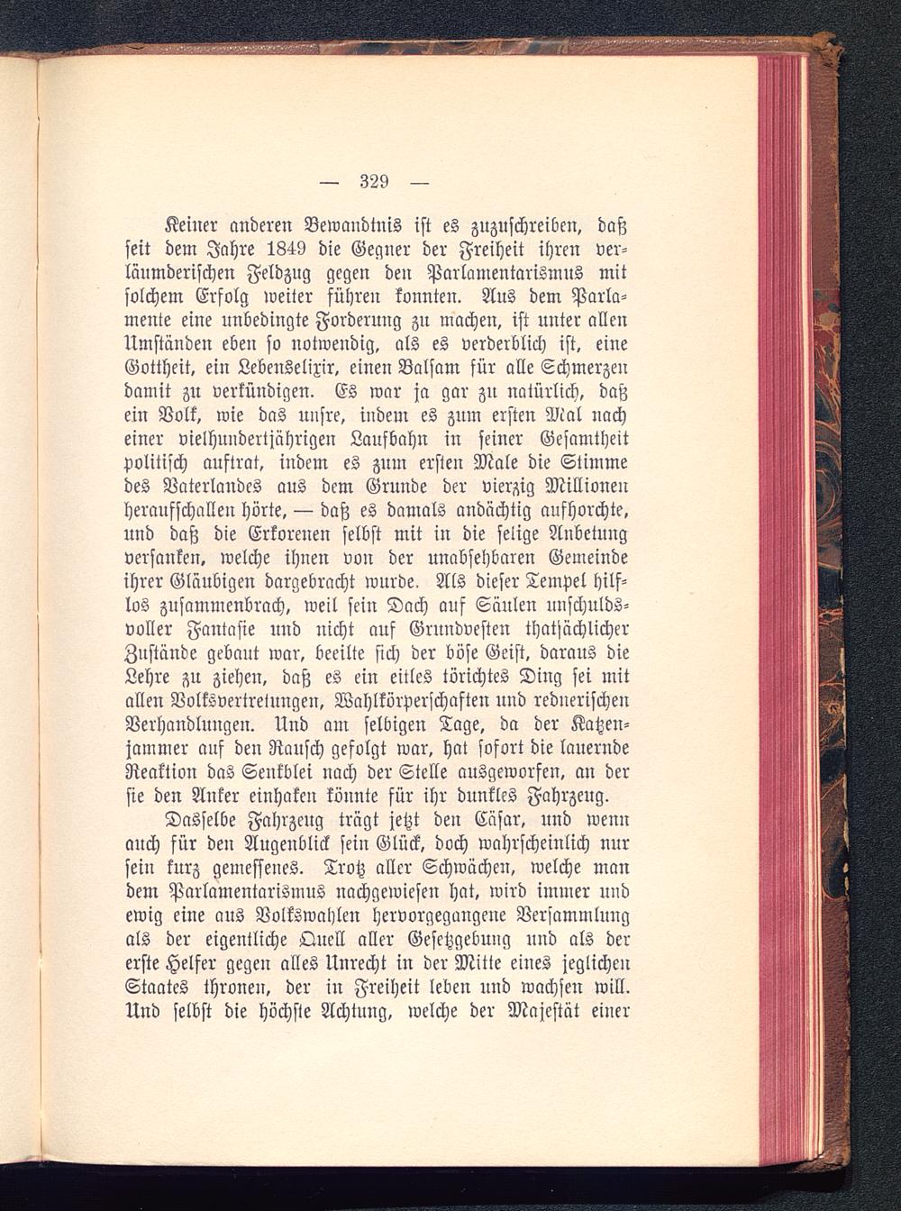 Dasselbe Fahrzeug trägt jetzt den Cäsar, und wennauch für den Augenblick sein Glück, doch wahrscheinlich nursein kurz gemessenes. Trotz aller Schwächen, welche mandem Parlamentarismus nachgewiesen hat, wird immer undewig eine aus Volkswahlen hervorgegangene Versammlungals der eigentliche Qnell aller Gesetzgebung und als dererste Helfer gegen alles Unrecht in der Mitte eines jeglichenStaates thronen, der in Freiheit leben und wachsen will.Und selbst die höchste Achtung, welche der Majestät einer