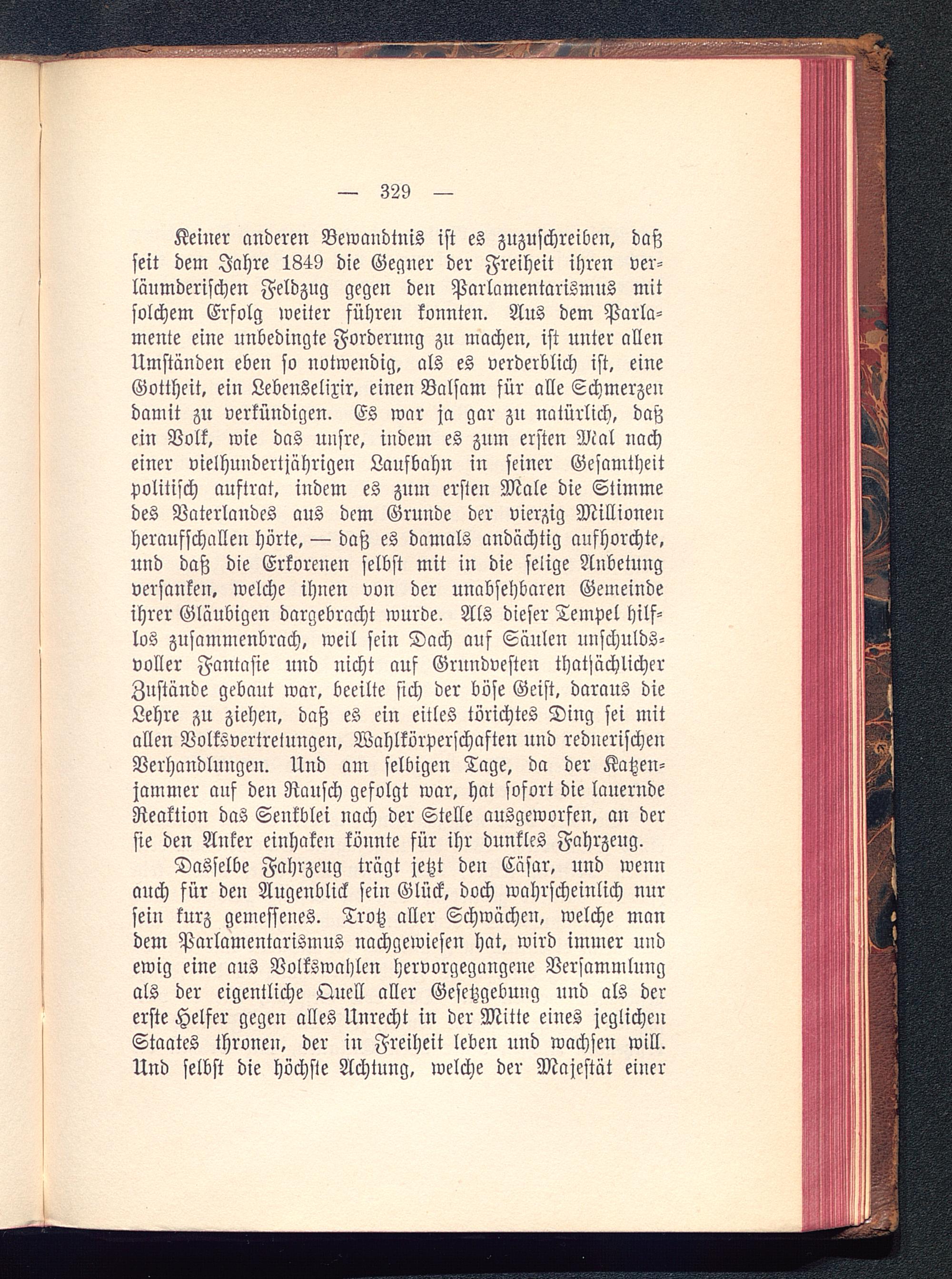 Keiner anderen Bewandtnis ist es zuzuschreiben, daßseit dem Jahre 1849 die Gegner der Freiheit ihren ver-läumderischen Feldzug gegen den Parlamentarismus mitsolchem Erfolg weiter führen konnten. Aus dem Parla-mente eine unbedingte Forderung zu machen, ist unter allenUmständen eben so notwendig, als es verderblich ist, eineGottheit, ein Lebenselixir, einen Balsam für alle Schmerzendamit zu verkündigen. Es war ja gar zu natürlich, daßein Volk, wie das unsre, indem es zum ersten Mal nacheiner vielhundertjährigen Laufbahn in seiner Gesamtheitpolitisch auftrat, indem es zum ersten Male die Stimmedes Vaterlandes aus dem Grunde der vierzig Millionenheraufschallen hörte, — daß es damals andächtig aufhorchte,und daß die Erkorenen selbst mit in die selige Anbetungversanken, welche ihnen von der unabsehbaren Gemeindeihrer Gläubigen dargebracht wurde. Als dieser Tempel hilf-los zusammenbrach, weil sein Dach auf Säulen unschulds-voller Fantasie nnd nicht auf Grundvesten thatsächlicherZustände gebaut war, beeilte sich der böse Geist, daraus dieLehre zu ziehen, daß es ein eitles törichtes Ding sei mitallen Volksvertretungen, Wahlkörperschaften und rednerischenVerhandlungen. Und am selbigen Tage, da der Katzen-jammer auf den Rausch gefolgt war, hat sofort die lauerndeReaktion das Senkblei nach der Stelle ausgeworfen, an dersie den Anker einhaken könnte für ihr dunkles Fahrzeug.