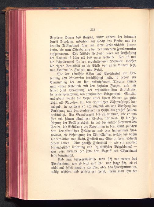 Wie der römische Cäsar das Proletariat mit Ver-teilung von Ländereien berücksichtigt hatte, so gehört zurErneuerung der an ihn anknüpfenden Theorie immerauch etwas Koketterie mit den sozialen Fragen, und wieseiner Zeit Verachtung der republikanischen Aristokratie,so heute Verachtung des freisinnigen Bürgertums. Gänzlichausgebaut wurde die Lehre unter ihrem Namen zu guterLetzt, als Napoleon III. den eigentlichen Cäsarenspiegel her-ausgab, in welchem er sich zugleich als das Werkzeug derVorsehung und den Nachfolger im Geiste des großen Juliersverkündigt. Der Grundbegriff des Cäsarismus, wie er unshier aus seinem allmäligen Werden klar wird, ist die Zu-spitzung der Volksherrschaft in das persönliche Regiment desGenies, die Erfüllung der Revolution in dem Bund zwischendem demokratischen Feldherrn und dem hungernden Pro-letariat, die Beseitigung der Mittelklassen, welche bis dahindie Tradition von Recht, Freiheit und Sitte in ihrem Schooßgehegt hatten. Eine gewisse Frivolität — wie ein gewisserdemagogischer Ursprung und sozialistischer Beigeschmack —war vom Urvater her stets dem Begriff des Cäsarismusleise beigemischt.