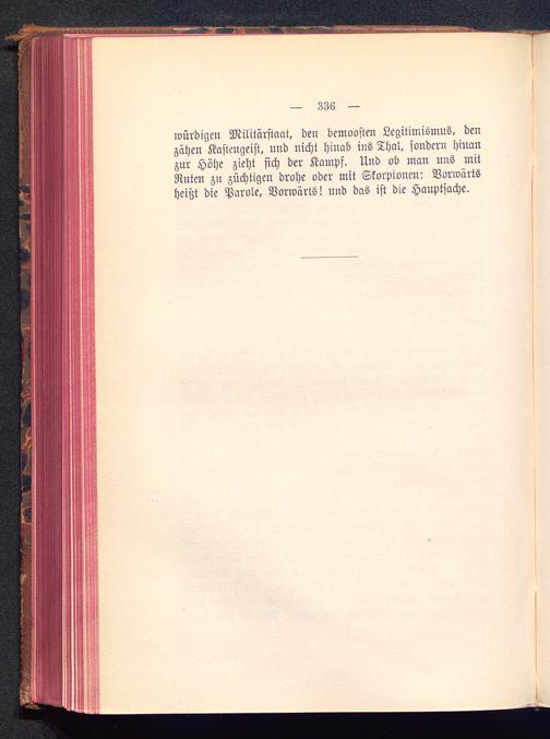 würdigen Militärstaat, den bemoosten Legitimismus, denzähen Kastengeist, und nicht hinab ins Thai, sondern hinanzur Höhe zieht sich der Kampf. Und ob man uns mitRuten zu züchtigen drohe oder mit Skorpionen: Vorwärtsheißt die Parole, Vorwärts! und das ist die Hauptsache.