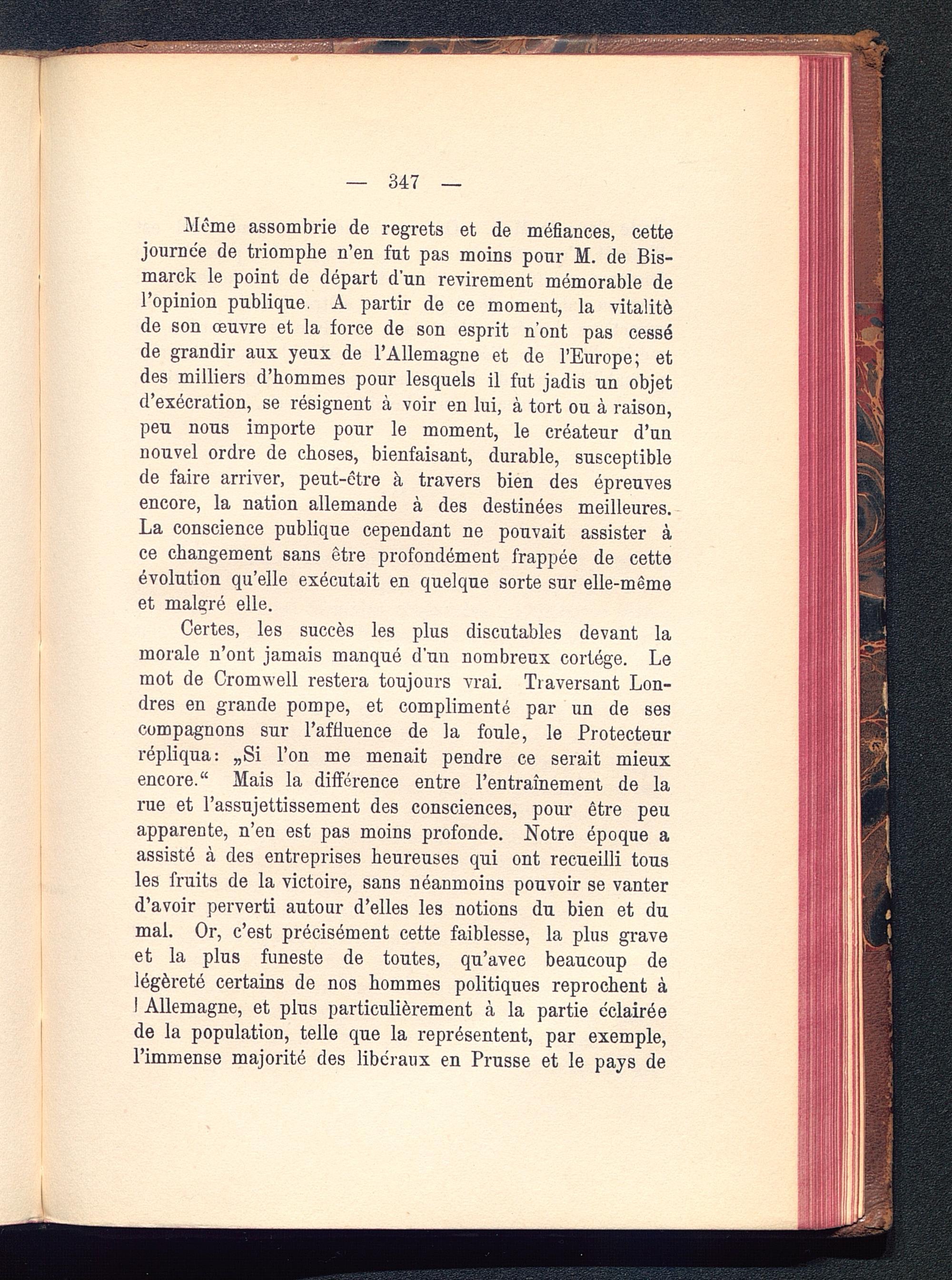 Certes, les succès les plus discutables devant lamorale n’ont jamais manqué d'un nombreux cortège. Lemot de Cromwell restera toujours vrai. Traversant Lon-dres en grande pompe, et complimenté par un de sescompagnons sur l’affluence de la foule, le Protecteurrépliqua: „Si l’on me menait pendre ce serait mieuxencore." Mais la différence entre l’entraînement de larue et l’assujettissement des consciences, pour être peuapparente, n’en est pas moins profonde. Notre époque aassisté à des entreprises heureuses qui ont recueilli tousles fruits de la victoire, sans néanmoins pouvoir se vanterd’avoir perverti autour d’elles les notions du bien et dumal. Or, c’est précisément cette faiblesse, la plus graveet la plus funeste de toutes, qu’avec beaucoup delégèreté certains de nos hommes politiques reprochent àI Allemagne, et plus particulièrement à la partie éclairéede la population, telle que la représentent, par exemple,l’immense majorité des libéraux en Prusse et le pays de