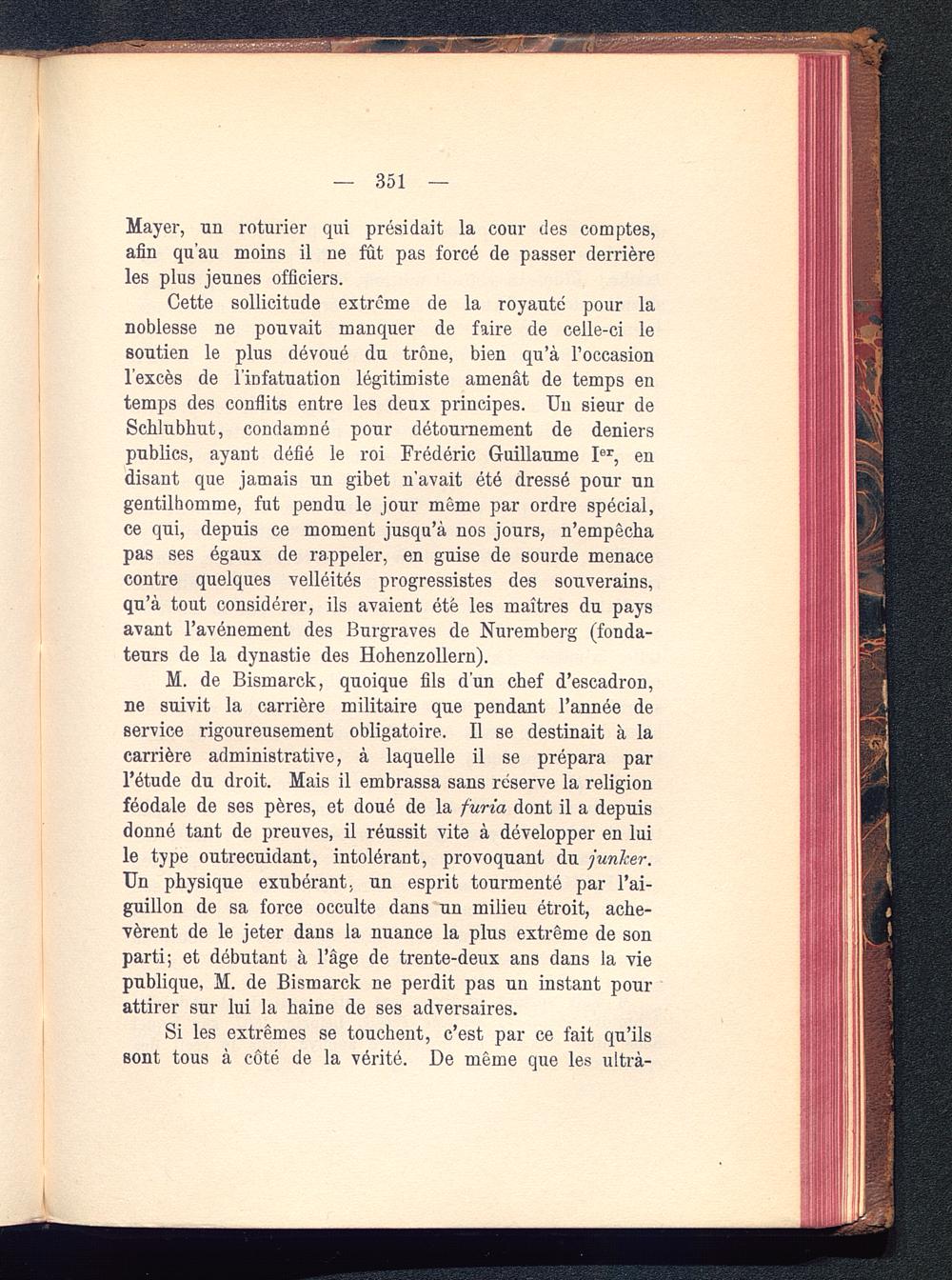 M. de Bismarck, quoique fils d’un chef d’escadron,ne suivit la carrière militaire que pendant l’année deservice rigoureusement obligatoire. Il se destinait à lacarrière administrative, à laquelle il se prépara parl’étude du droit. Mais il embrassa sans réserve la religionféodale de ses pères, et doué de la furia dont il a depuisdonné tant de preuves, il réussit vite à développer en luile type outrecuidant, intolérant, provoquant du junker.Un physique exubérant, un esprit tourmenté par l’ai-guillon de sa force occulte dans un milieu étroit, ache-vèrent de le jeter dans la nuance la plus extrême de sonparti; et débutant à l’âge de trente-deux ans dans la viepublique, M. de Bismarck ne perdit pas un instant pourattirer sur lui la haine de ses adversaires.