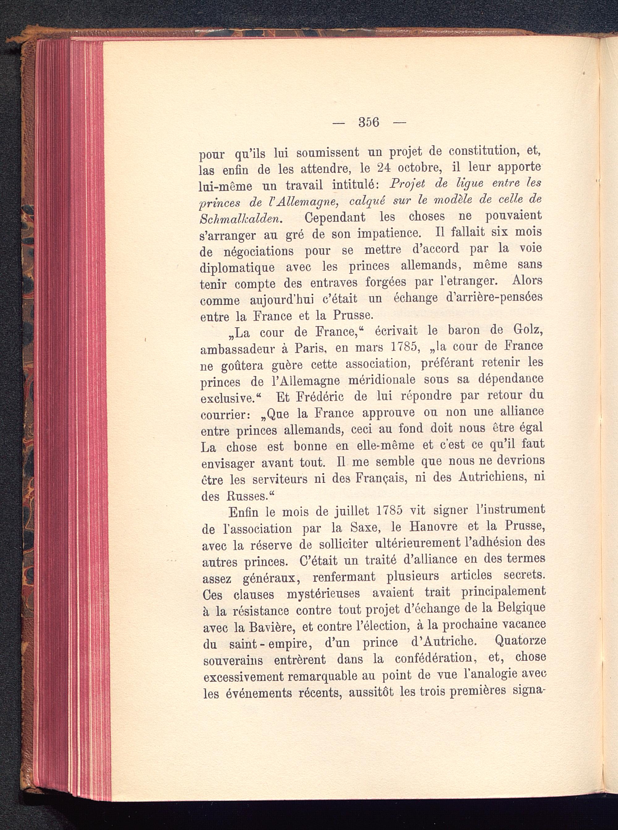 „La cour de France," écrivait le baron de Golz,ambassadeur à Paris , en mars 1785, „la cour de Francene goûtera guère cette association, préférant retenir lesprinces de l’Allemagne méridionale sous sa dépendanceexclusive." Et Frédéric de lui répondre par retour ducourrier: „Que la France approuve ou non une allianceentre princes allemands, ceci au fond doit nous être égalLa chose est bonne en elle-même et c’est ce qu’il fautenvisager avant tout. Il me semble que nous ne devrionsêtre les serviteurs ni des Français, ni des Autrichiens, nides Russes."