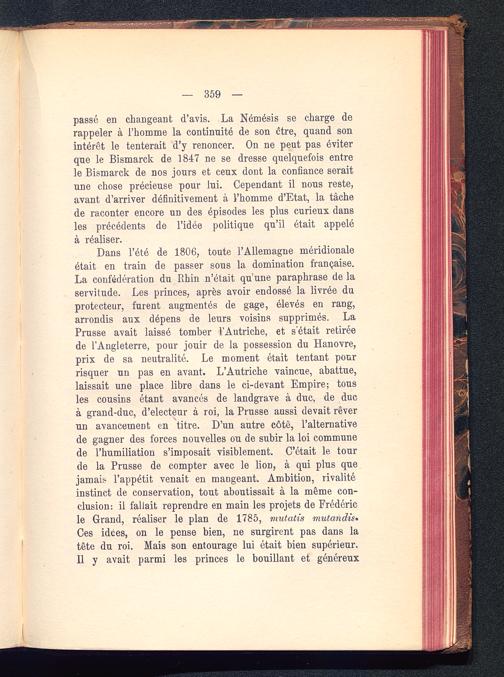 passé en changeant d’avis. La Némésis se charge derappeler à l’homme la continuité de son être, quand sonintérêt le tenterait d’y renoncer. On ne peut pas éviterque le Bismarck de 1847 ne se dresse quelquefois entrele Bismarck de nos jours et ceux dont la confiance seraitune chose précieuse pour lui. Cependant il nous reste,avant d’arriver définitivement à l’homme d’Etat, la tâchede raconter encore un des épisodes les plus curieux dansles précédents de l’idée politique qu’il était appeléà réaliser.