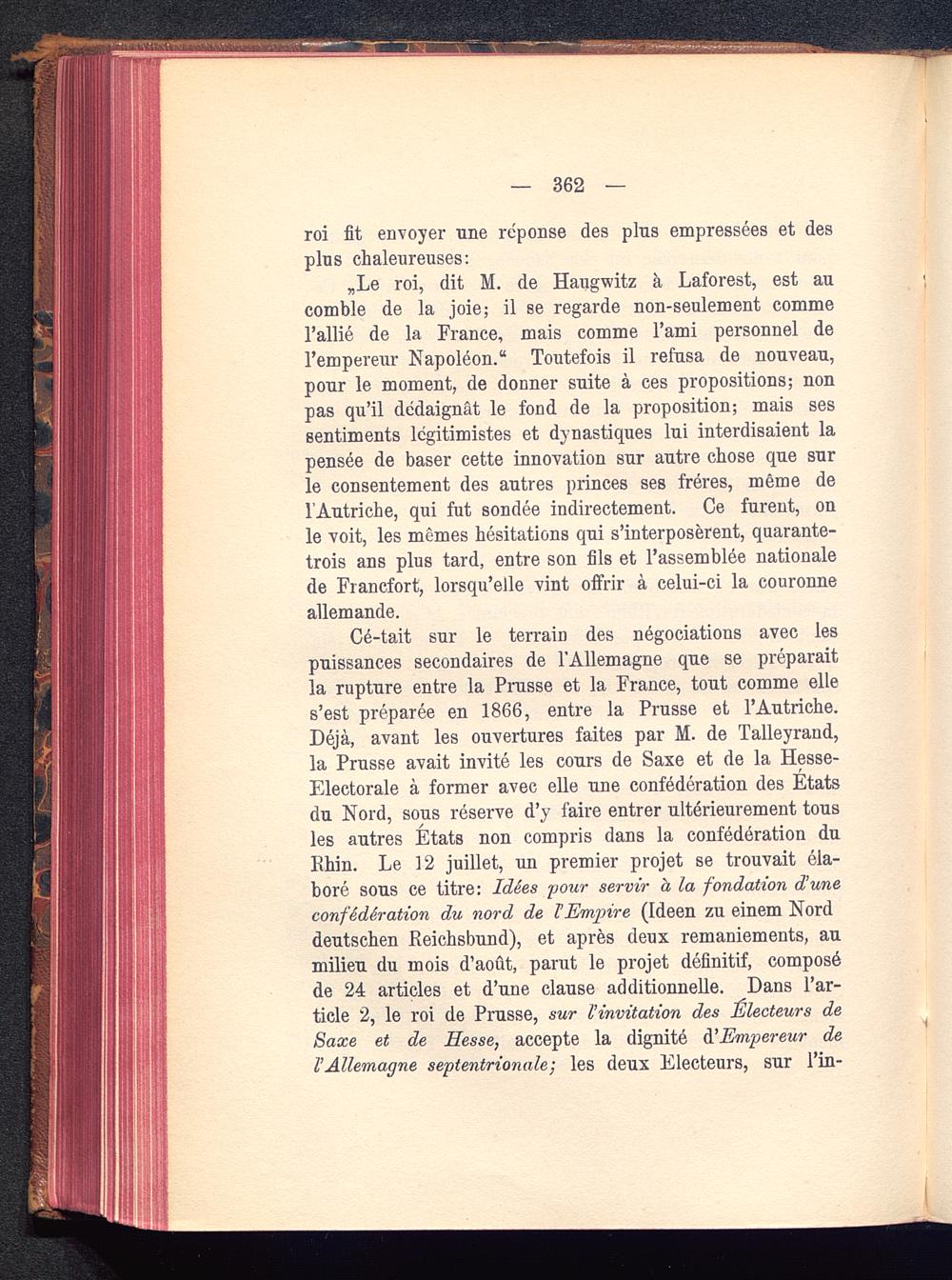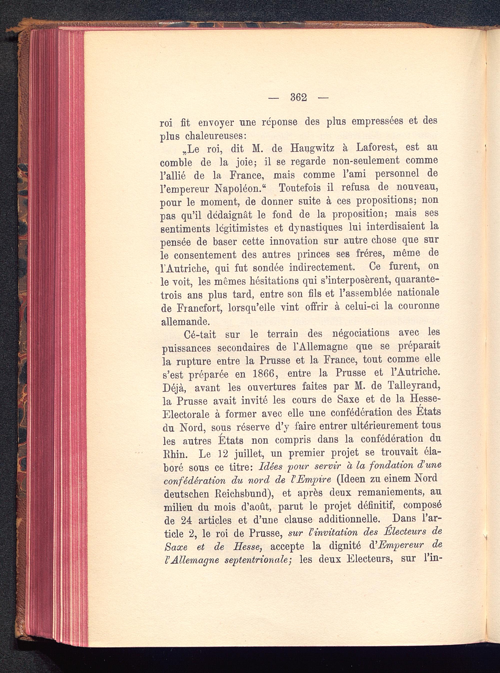 „Le roi, dit M. de Haugwitz à Laforest, est aucomble de la joie; il se regarde non-seulement commel’allié de la France , mais comme l’ami personnel del’empereur Napoléon ." Toutefois il refusa de nouveau,pour le moment, de donner suite à ces propositions; nonpas qu’il dédaignât le fond de la proposition; mais sessentiments légitimistes et dynastiques lui interdisaient lapensée de baser cette innovation sur autre chose que surle consentement des autres princes ses frères, même del’Autriche , qui fut sondée indirectement. Ce furent, onle voit, les mêmes hésitations qui s’interposèrent, quarante-trois ans plus tard, entre son fils et l’assemblée nationalede Francfort , lorsqu’elle vint offrir à celui-ci la couronneallemande.