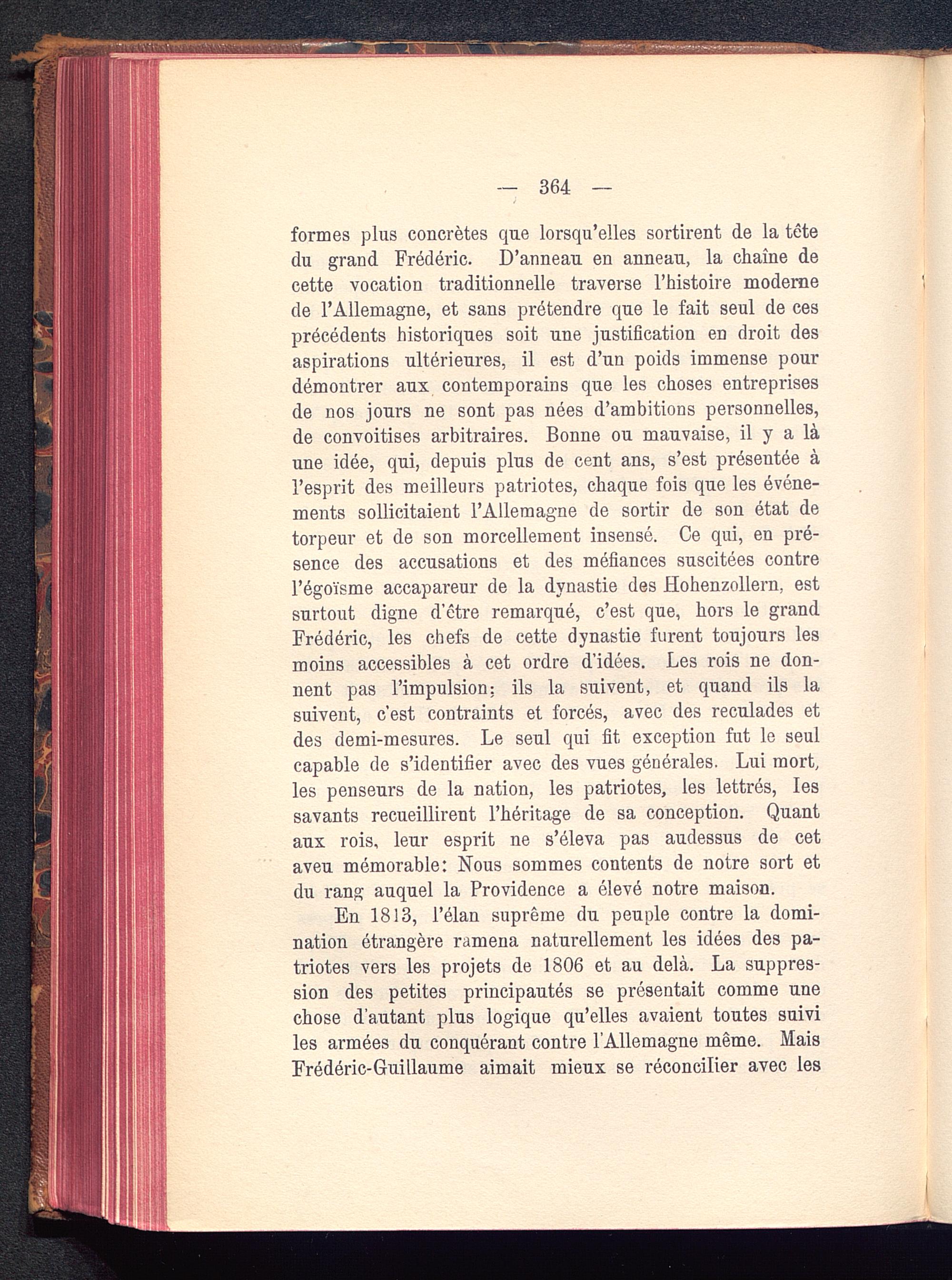 En 1813, l’élan suprême du peuple contre la domi-nation étrangère ramena naturellement les idées des pa-triotes vers les projets de 1806 et au delà. La suppres-sion des petites principautés se présentait comme unechose d’autant plus logique qu’elles avaient toutes suiviles armées du conquérant contre l’Allemagne même. MaisFrédéric-Guillaume aimait mieux se réconcilier avec les