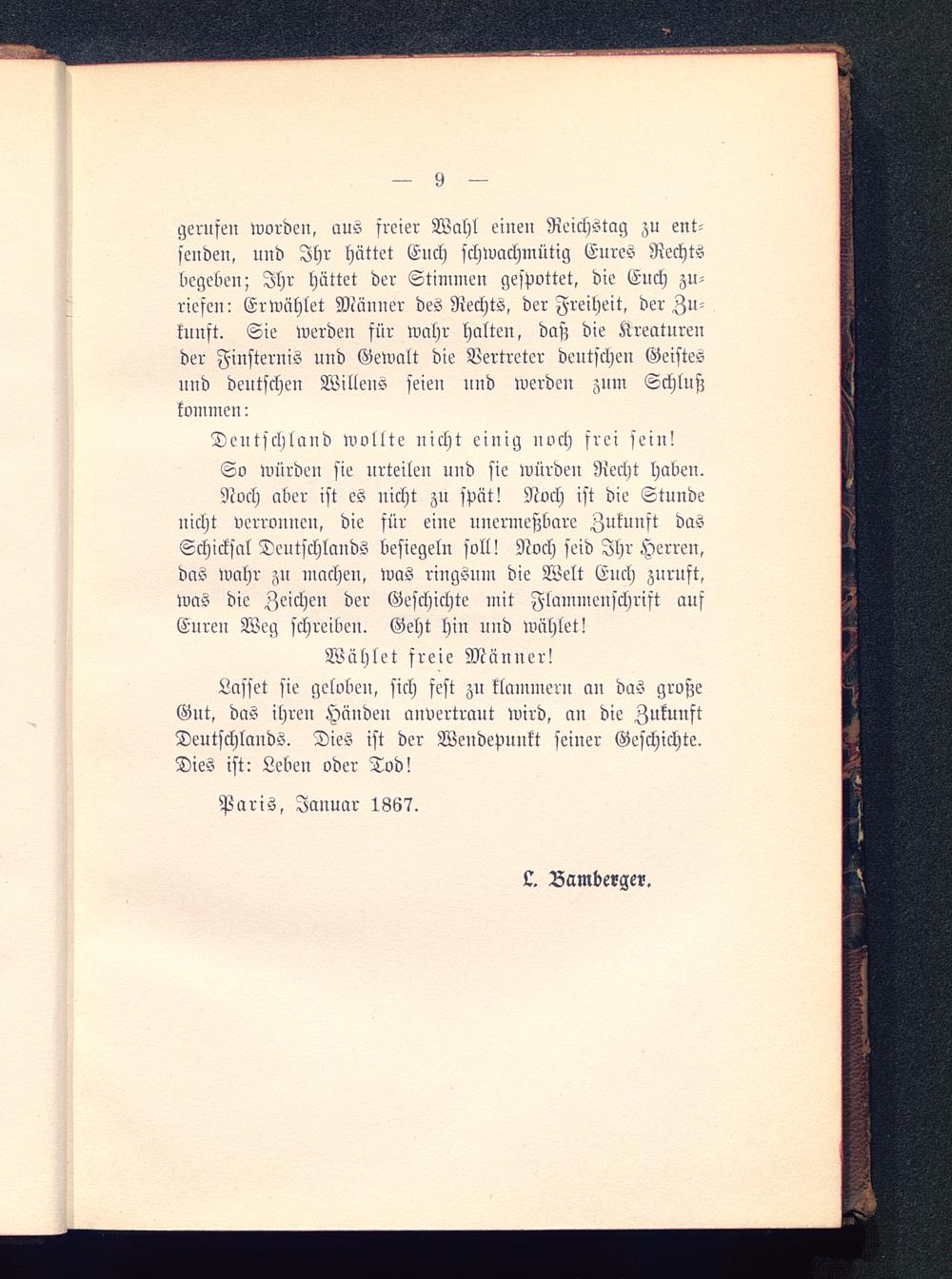 Wählet freie Männer!Lasset sie geloben, sich fest zu klammern an das großeGut, das ihren Häuden anvertraut wird, au die ZukunftDeutschlands . Dies ist der Wendepunkt seiner Geschichte.Dies ist: Leben oder Tod!