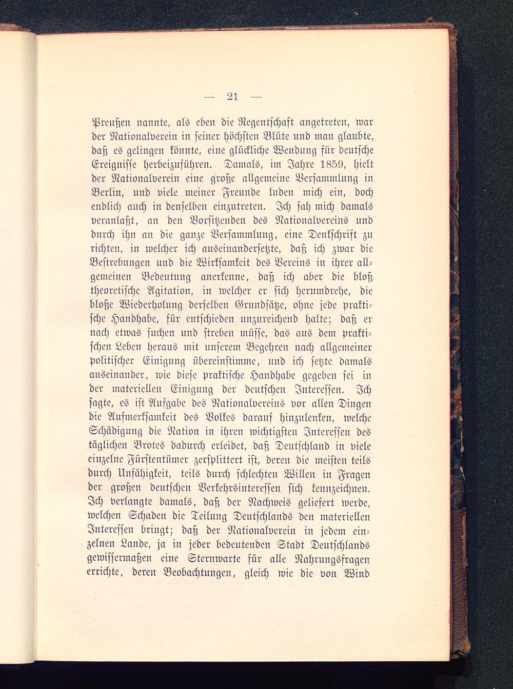 Preußen nannte, als eben die Regentschaft angetreten, warder Nationalverein in seiner höchsten Blüte und mau glaubte,daß es gelingen könnte, eine glückliche Wendung für deutsche Ereignisse herbeizuführen. Damals, im Jahre 1859, hieltder Nationalverein eine große allgemeine Versammlung inBerlin , und viele meiner Freunde lnden mich ein, dochendlich auch in denselben einzntreten. Ich sah mich damalsveranlaßt, an den Vorsitzenden des Nativnalvereins unddurch ihn an die ganze Versammlung, eine Denkschrift zurichten, in welcher ich auseinandersetzte, daß ich zwar dieBestrebnngen und die Wirksamkeit des Vereins in ihrer all-gemeinen Bedeutung anerkenne, daß ich aber die bloßtheoretische Agitatiou, iu welcher er sich herumdrehe, diebloße Wiederholung derselben Grundsätze, ohne jede Prakti-sche Handhabe, für entschieden unzureichend halte; daß ernach etwas suchen und streben müsse, das aus dem prakti-schen Leben heraus mit unserem Begehren nach allgemeinerpolitischer Einigung übereinstimme, und ich setzte damalsauseinander, wie diese praktische Handhabe gegeben sei inder materiellen Einigung der deutschen Interessen. Ichsagte, es ist Aufgabe des Nationalvereins vor allen Dingendie Aufmerksamkeit des Volkes darauf hinzulenken, welcheSchädigung die Nation in ihren wichtigsten Interessen destäglichen Brotes dadurch erleidet, daß Deutschland in vieleeinzelne Fürstentümer zersplittert ist, deren die meisten teilsdurch Unfähigkeit, teils durch schlechten Willen in Fragender großen deutschen Berkehrsinteressen sich kennzeichnen.Ich verlangte damals, daß der Nachweis geliefert werde,welchen Schaden die Teilung Deutschlands den materiellenInteressen bringt; daß der Nativnalverein in jedem ein-zelnen Lande, ja in jeder bedeutenden Stadt Deutschlands gewissermaßen eine Sternwarte für alle Nahrnngsfragenerrichte, deren Beobachtuugeu, gleich wie die von Wind